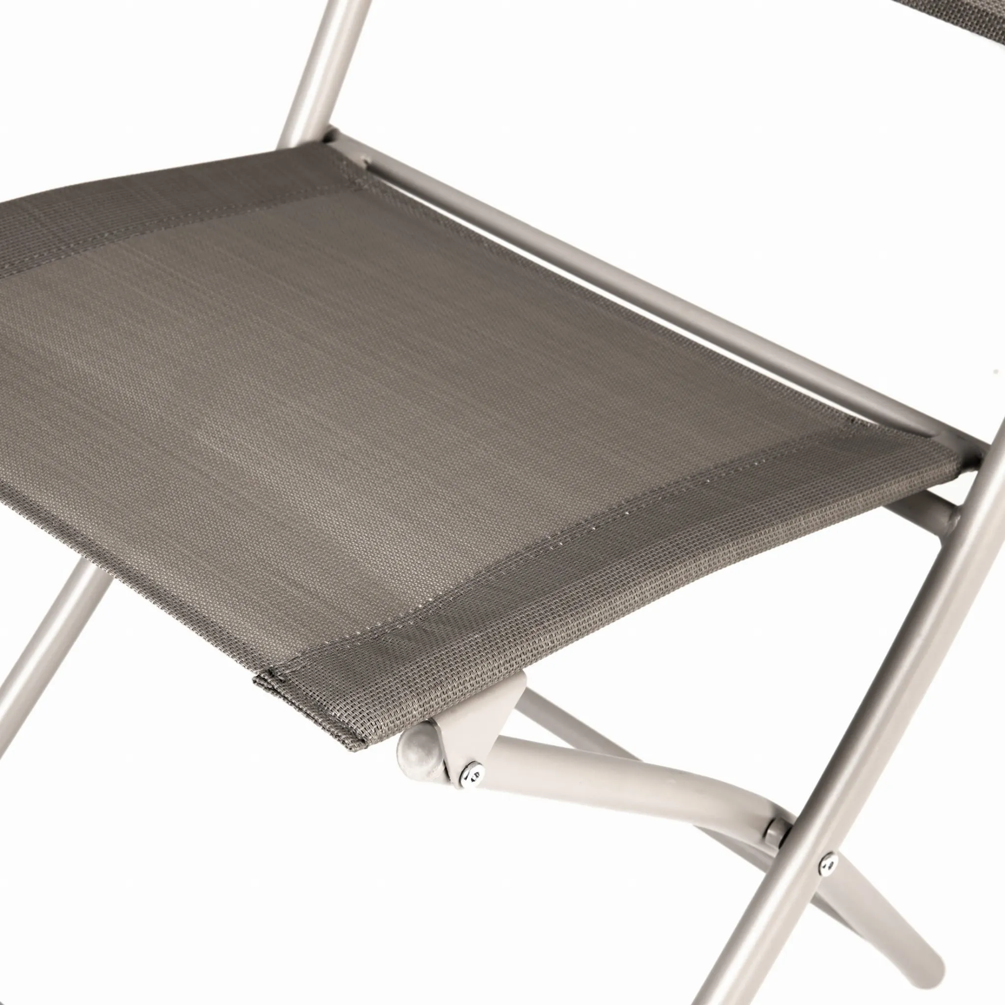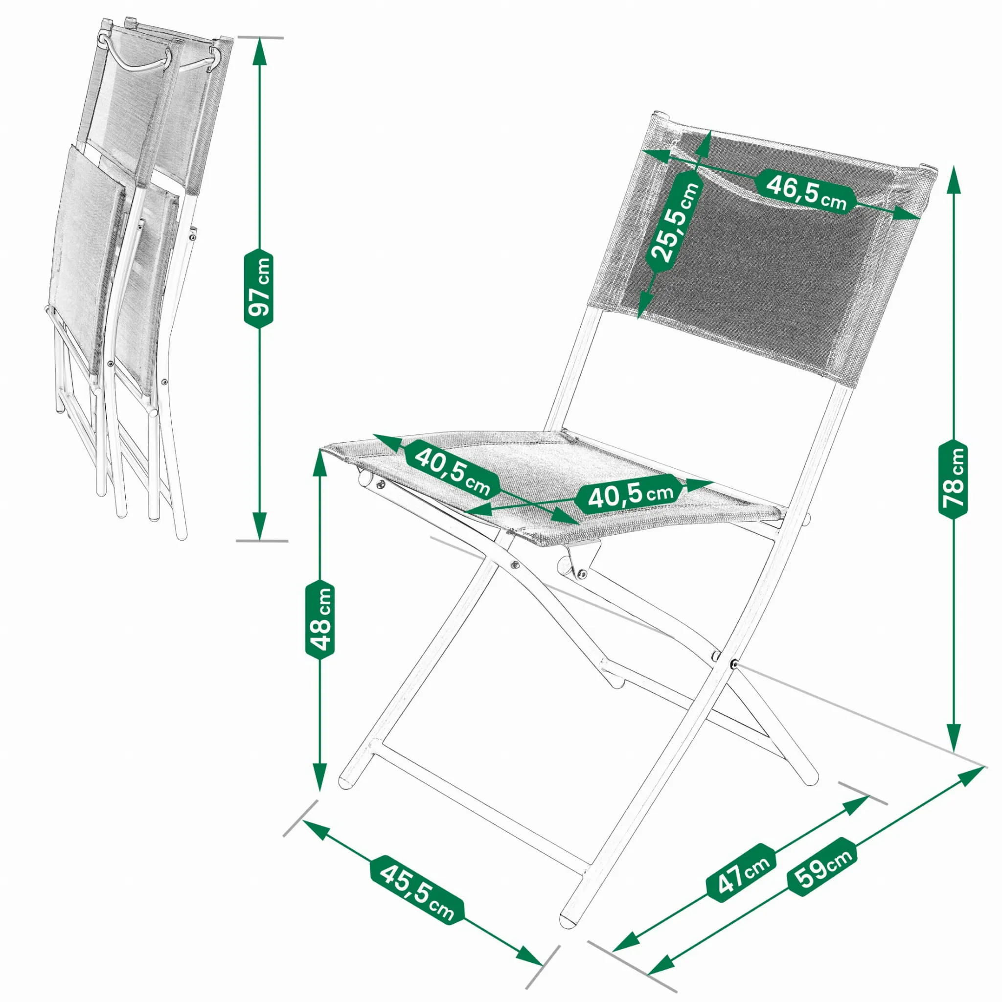 Wyprofilowane oparcie i siedzisko z przewiewnego tekstylenu – idealne na ciepłe dni. Możliwość złożenia ich sprawia, że po sezonie, zmieszczą się perfekcyjnie do komórki czy schowka.