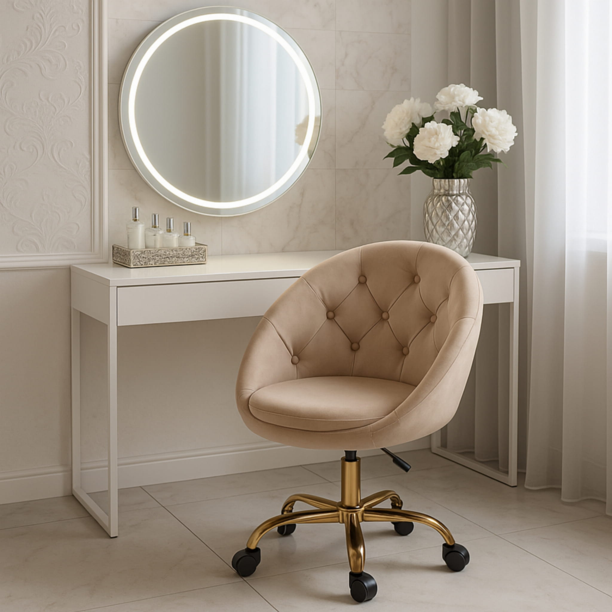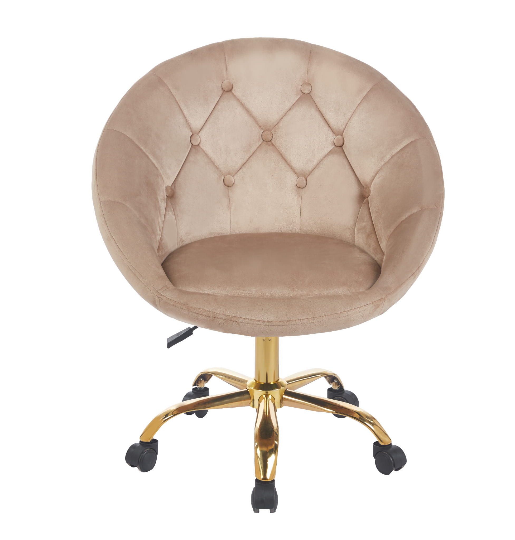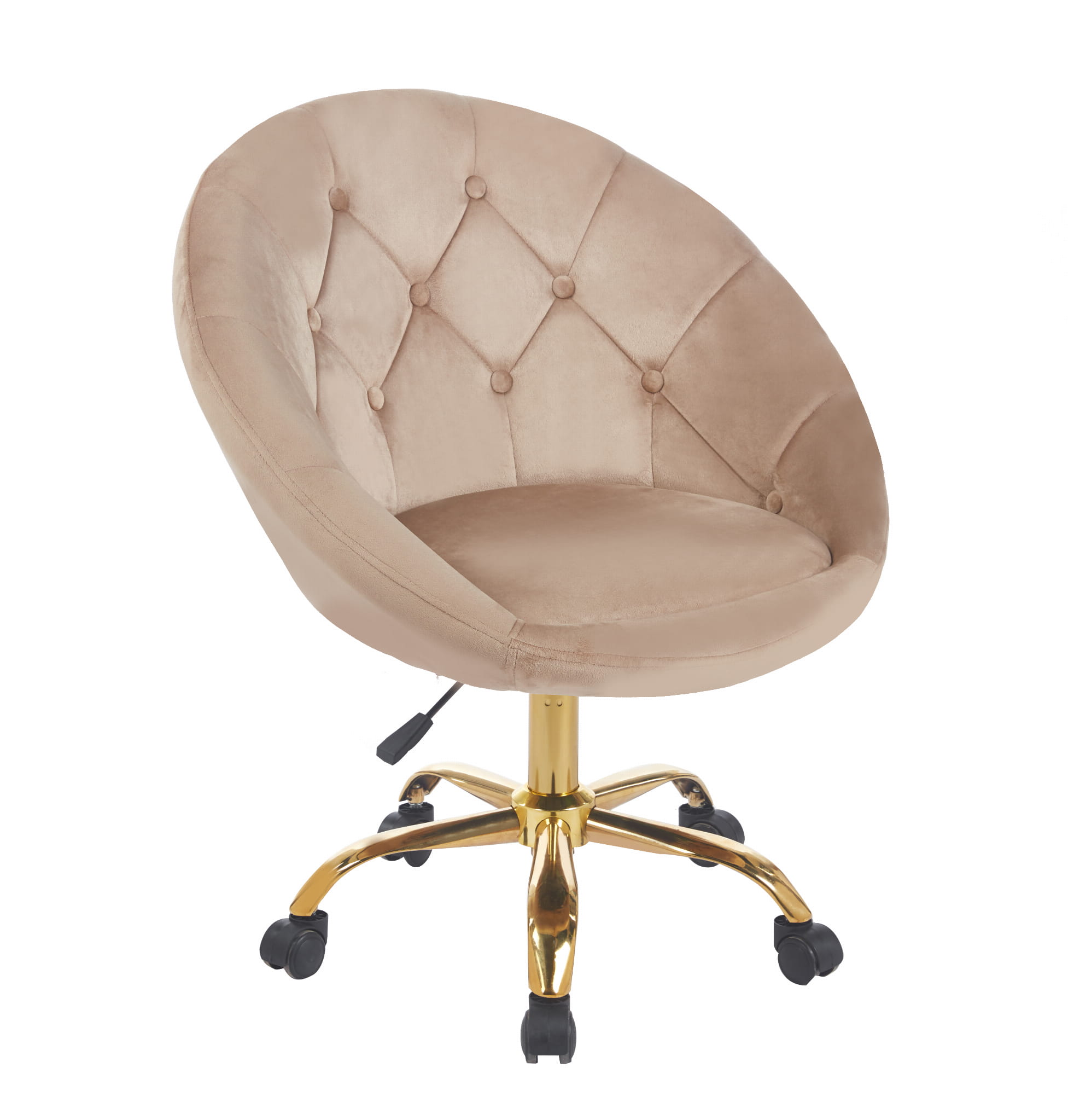 Wyrafinowany design w połączeniu z nowoczesnością tworzą ten stylowy fotel. Obrotowy, na kółkach, wykonany z przyjemnego w dotyku weluru w klasycznym i uniwersalnym odcieniu beżu, stanie się ozdobą każdego biura, toaletki, salonu kosmetycznego czy pokoju młodzieżowego.