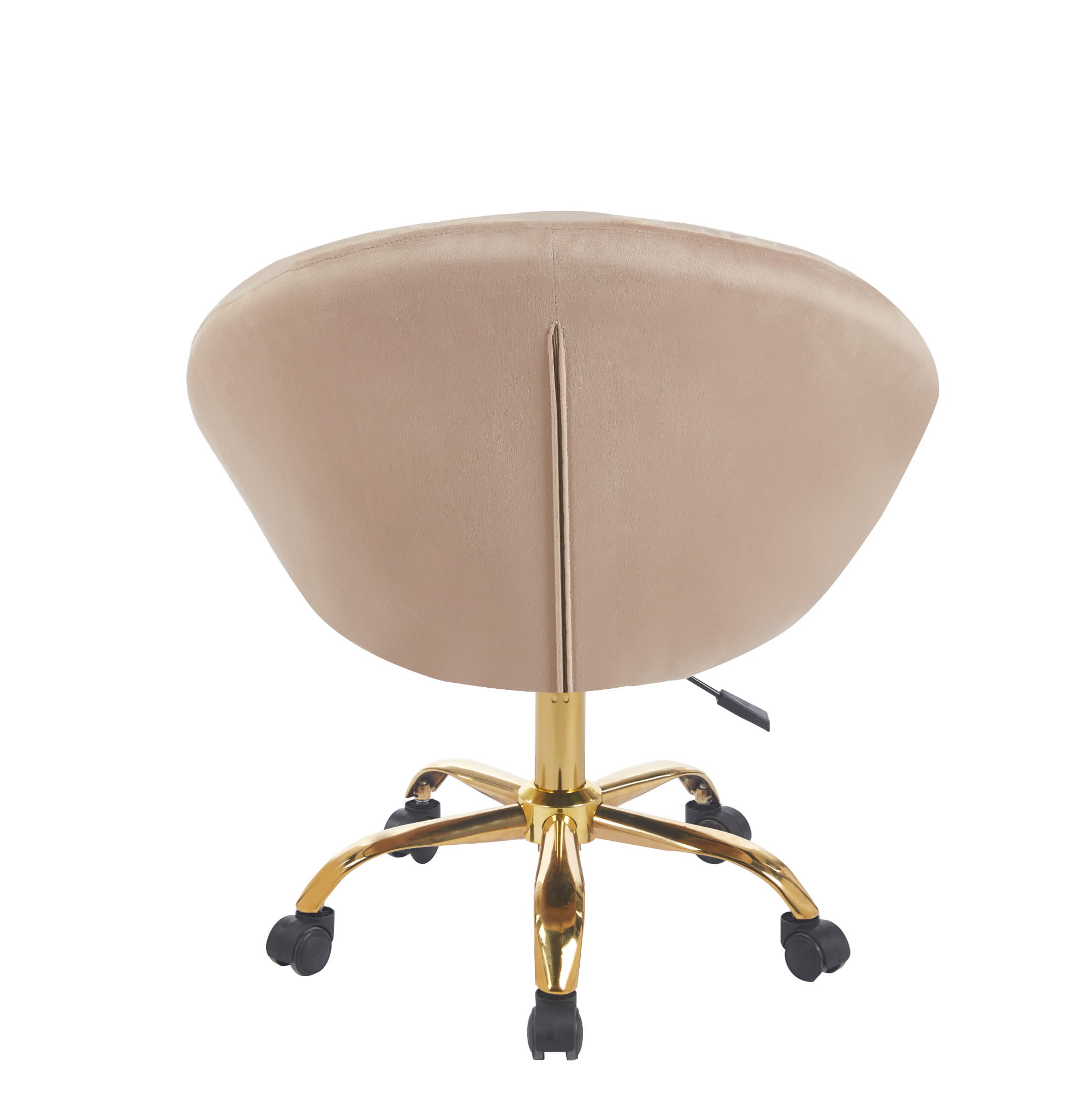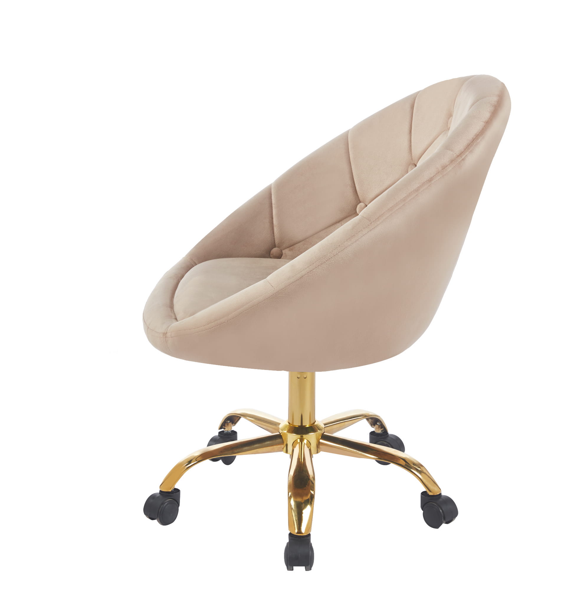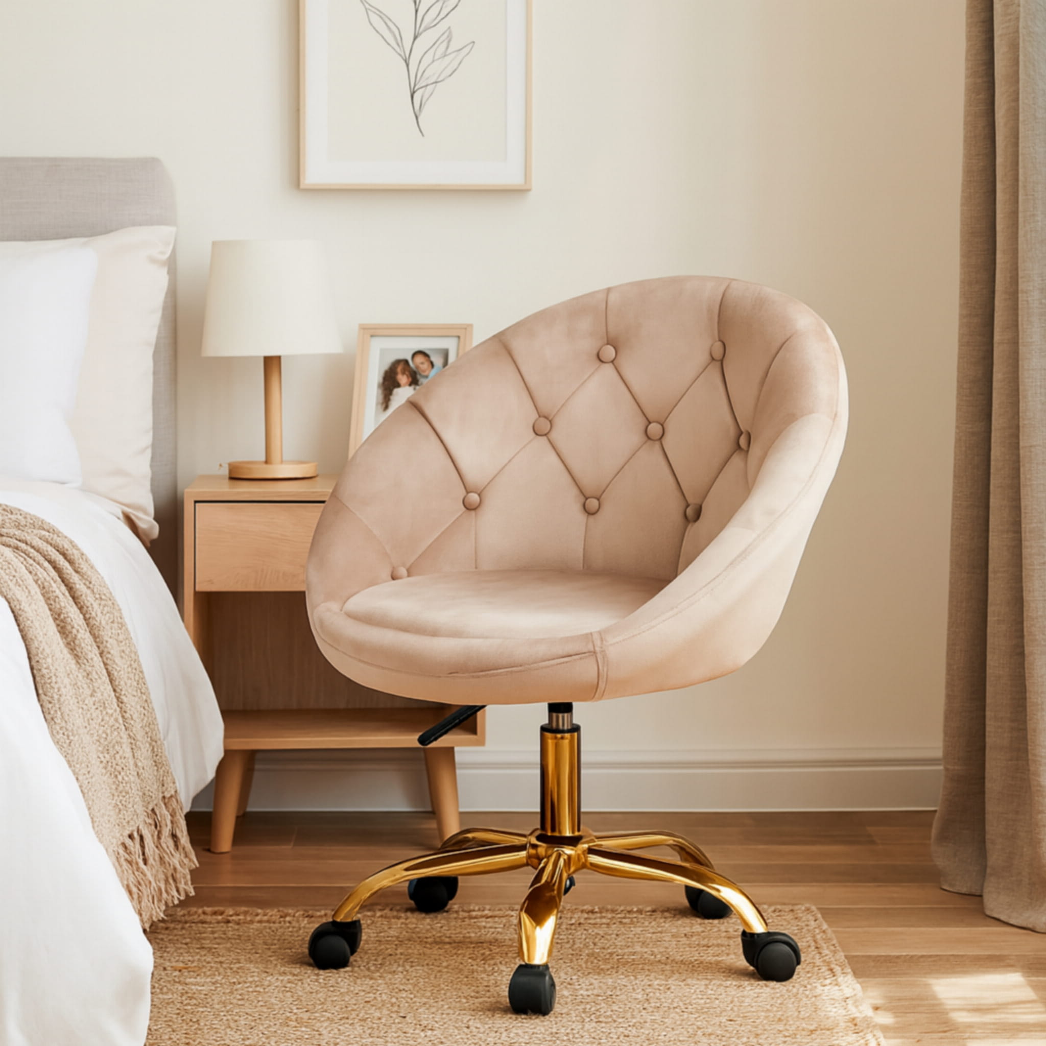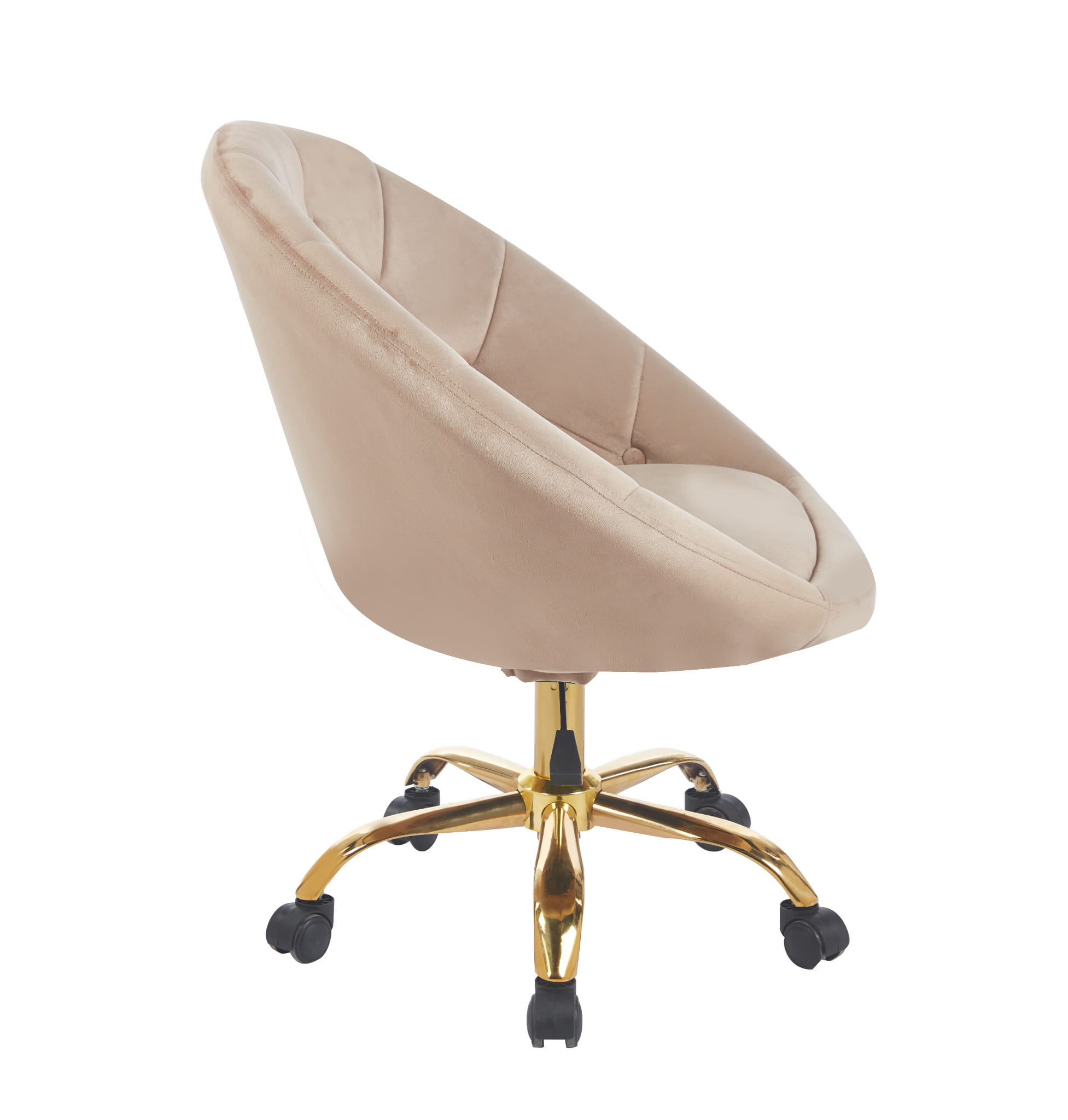 Wyrafinowany design w połączeniu z nowoczesnością tworzą ten stylowy fotel. Obrotowy, na kółkach, wykonany z przyjemnego w dotyku weluru w klasycznym i uniwersalnym odcieniu beżu, stanie się ozdobą każdego biura, toaletki, salonu kosmetycznego czy pokoju młodzieżowego.