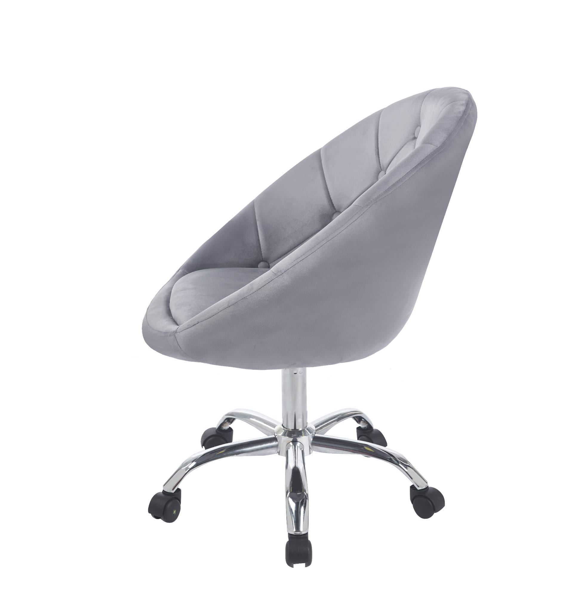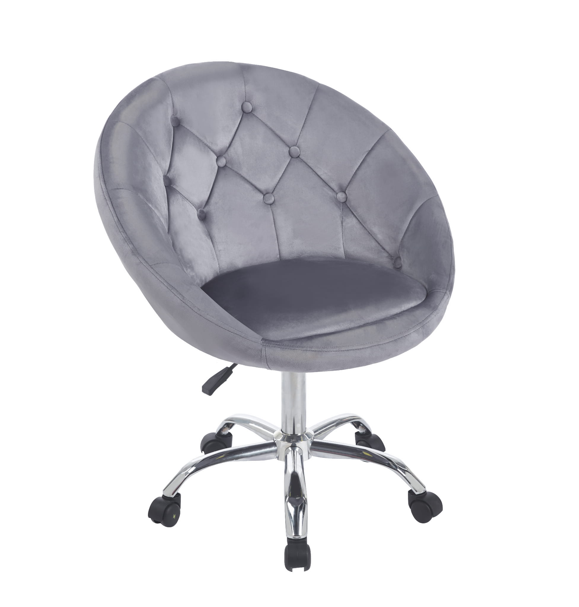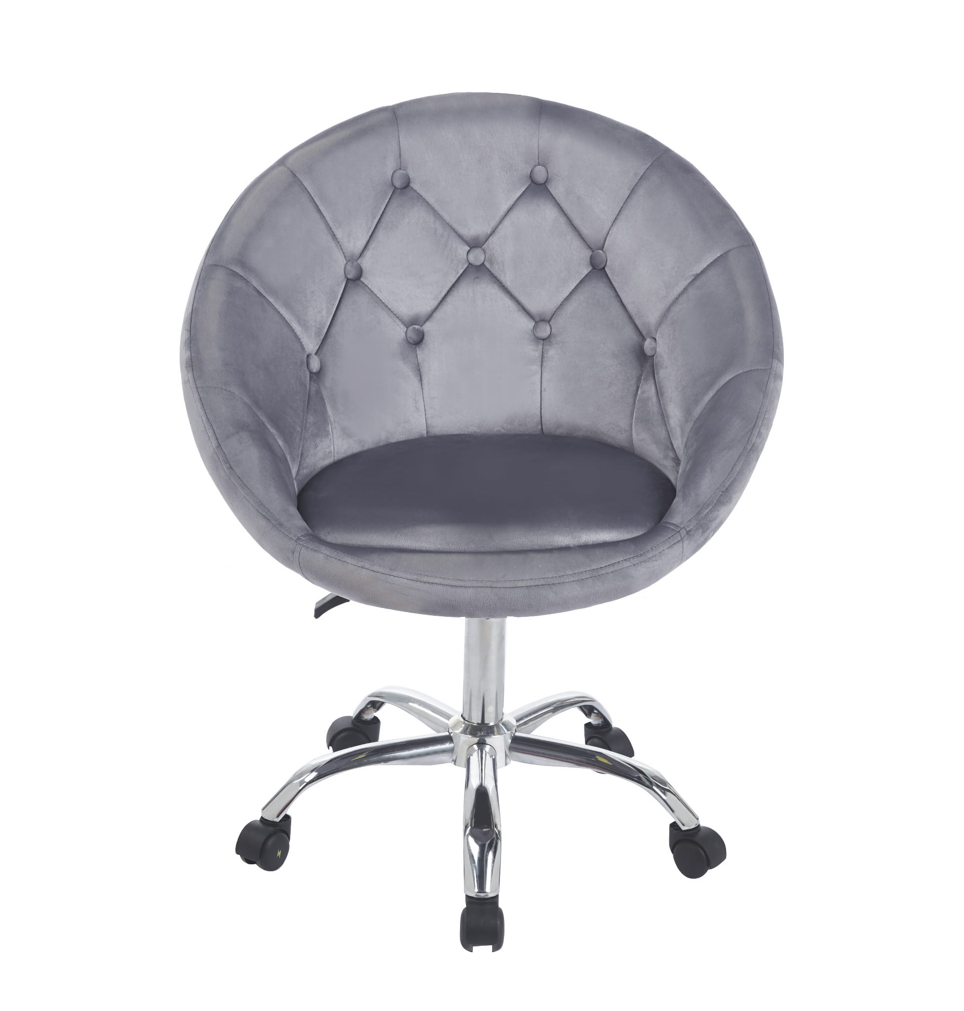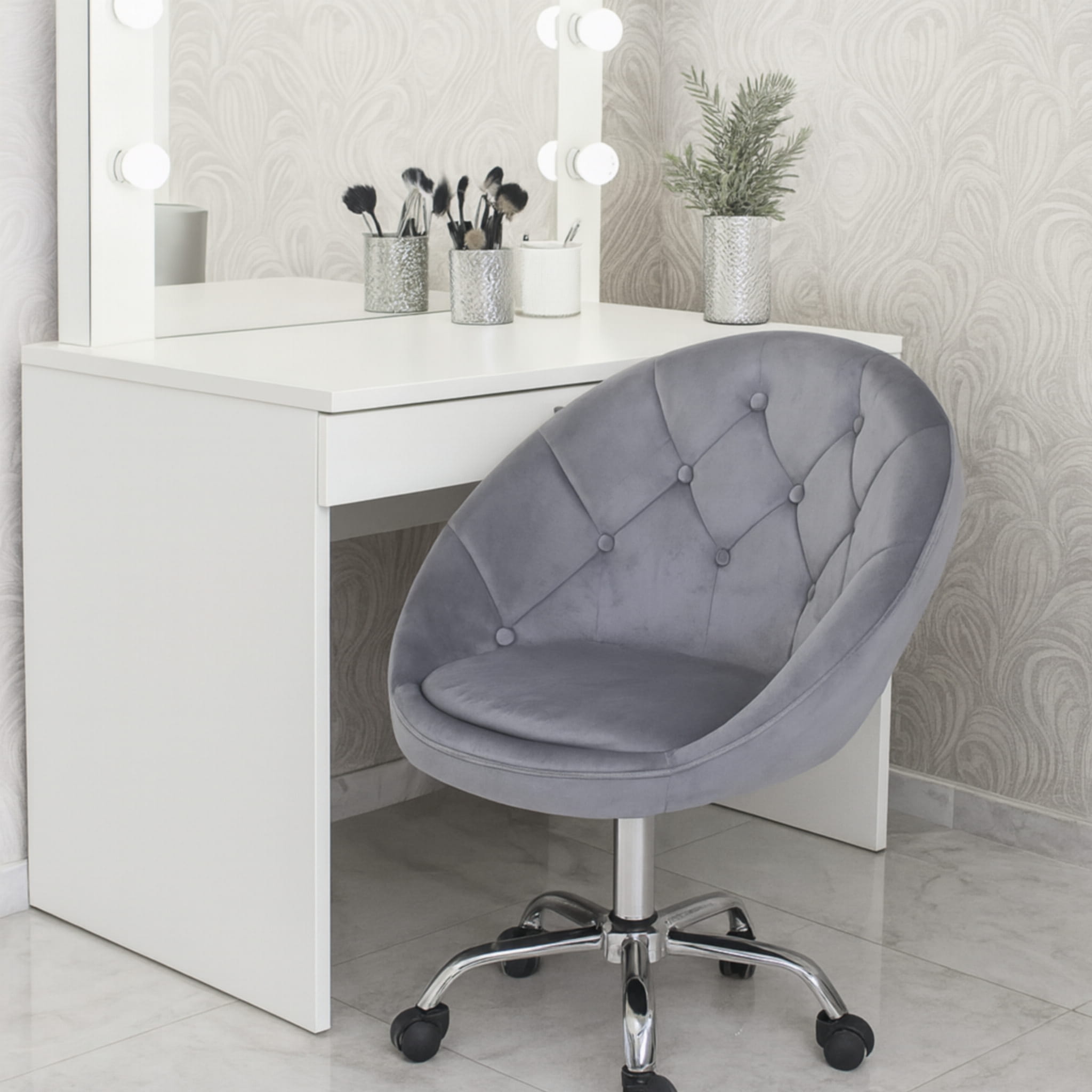 Wyrafinowany design w połączeniu z nowoczesnością tworzą ten stylowy fotel. Obrotowy, na kółkach, wykonany z przyjemnego w dotyku weluru w klasycznym i uniwersalnym odcieniu szarości, stanie się ozdobą każdego biura, toaletki, salonu kosmetycznego czy pokoju młodzieżowego.