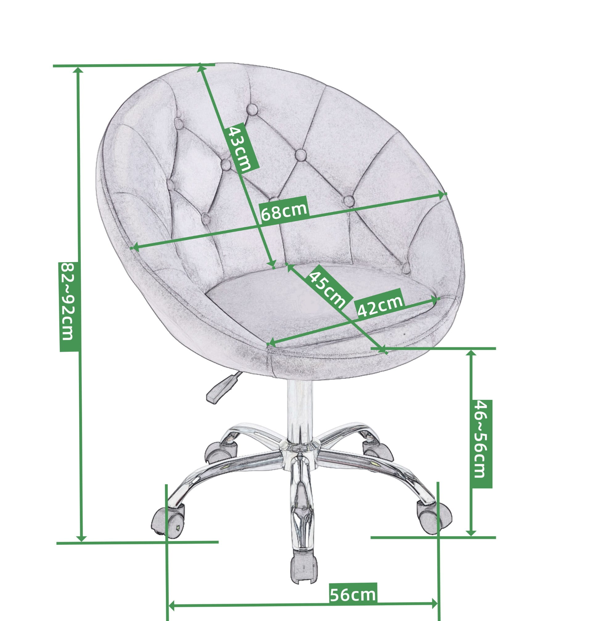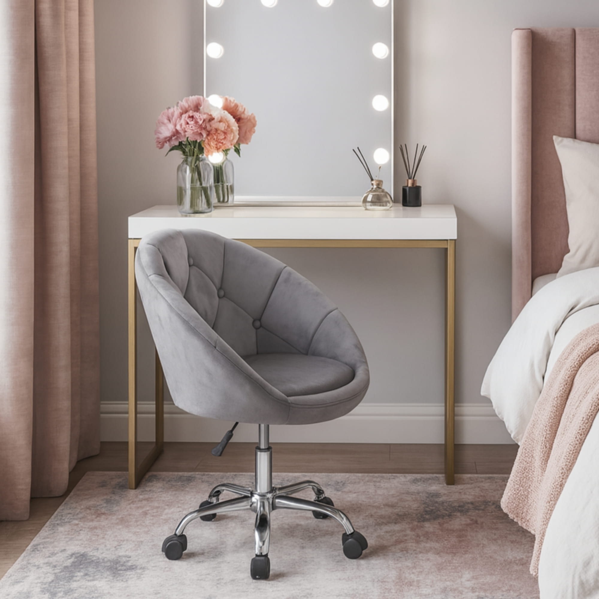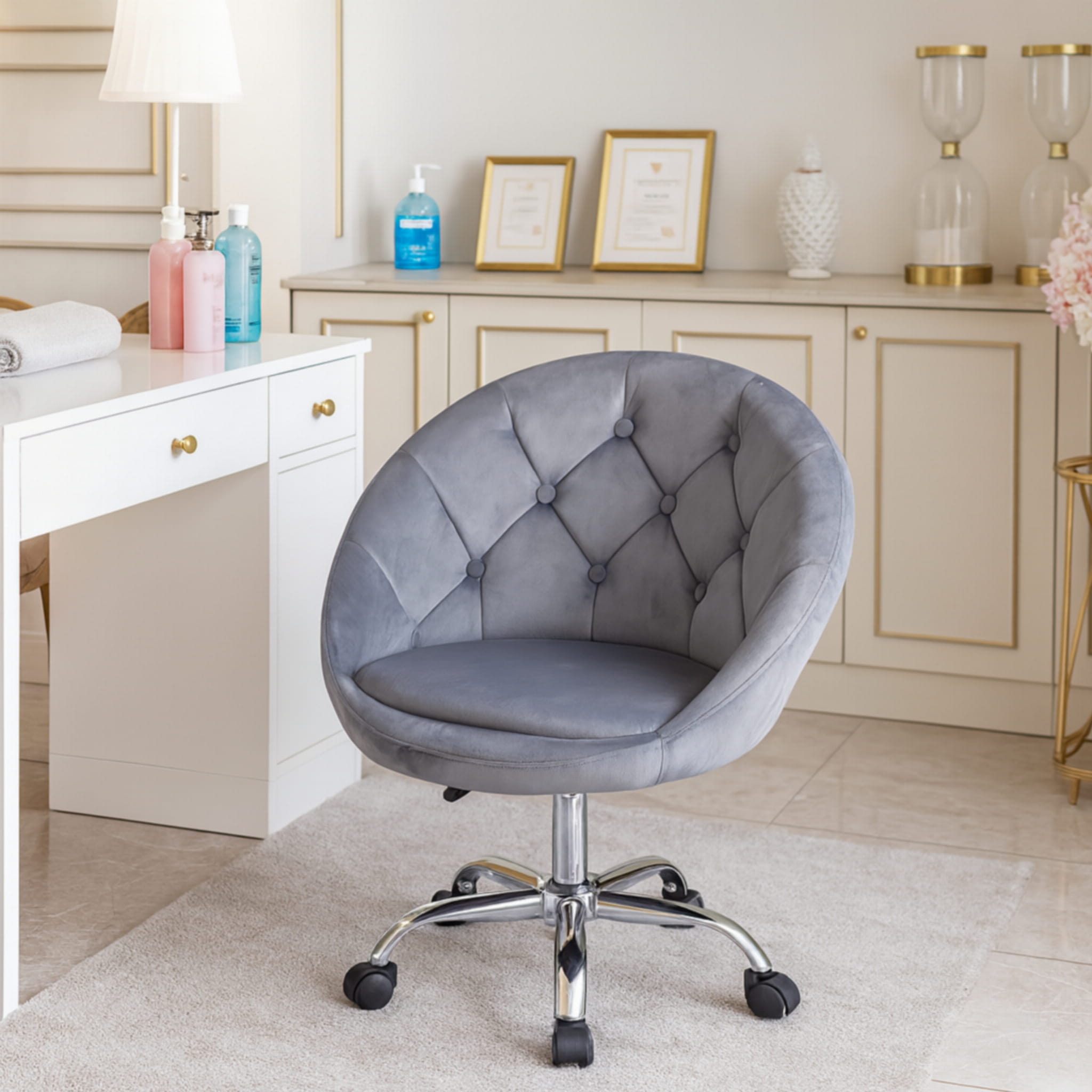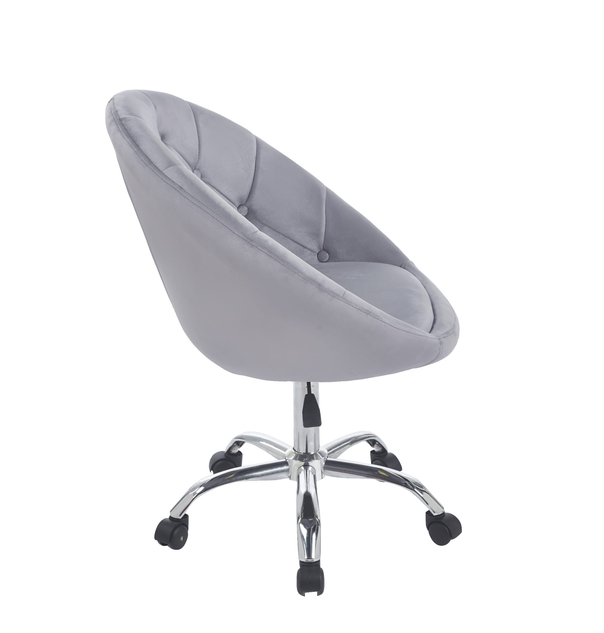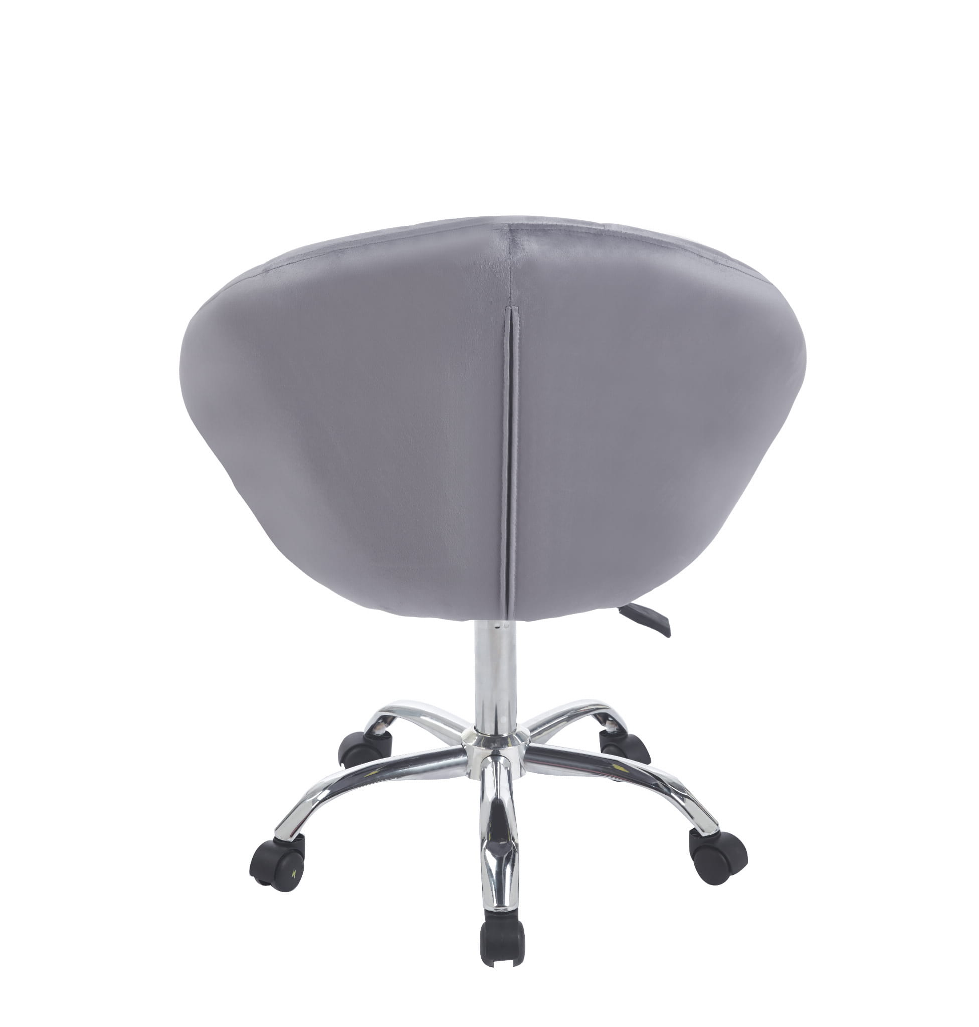 Wyrafinowany design w połączeniu z nowoczesnością tworzą ten stylowy fotel. Obrotowy, na kółkach, wykonany z przyjemnego w dotyku weluru w klasycznym i uniwersalnym odcieniu szarości, stanie się ozdobą każdego biura, toaletki, salonu kosmetycznego czy pokoju młodzieżowego.