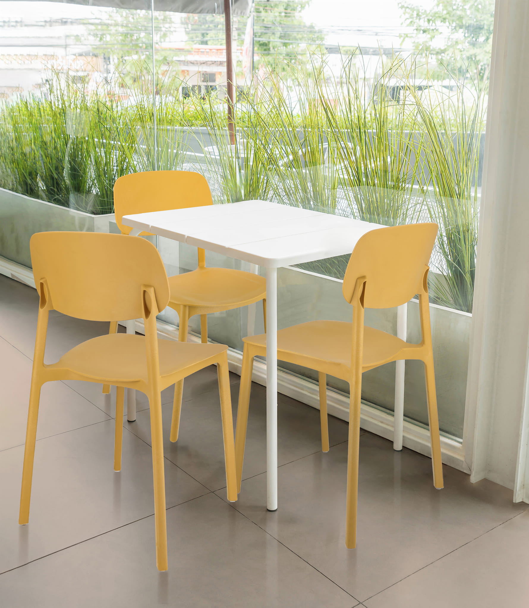 Krzesło wykonane zostało w jednej bryle - nie wymaga skręcania oraz jest odporne na działanie warunków atmosferycznych, dlatego może być używane zarówno wewnątrz, jak i na zewnątrz pomieszczeń.