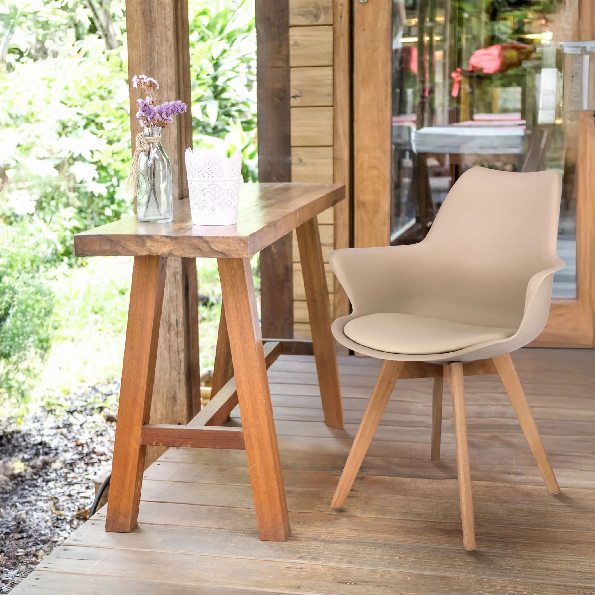 Posiada wyprofilowane oparcie, które w połączeniu z miękką poduszką umieszczoną na siedzisku zapewnia dużą wygodę. Wyróżnia się poprzez jego unikatową cechę, wymodelowane podłokietniki pozwalające na wygodne i komfortowe użytkowanie. Drewniane nogi wykonane są z buku, dzięki czemu zapewniają stabilność oraz trwałość użytkowania.