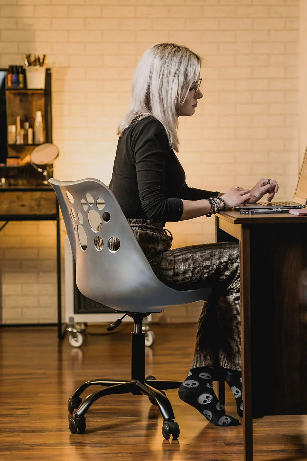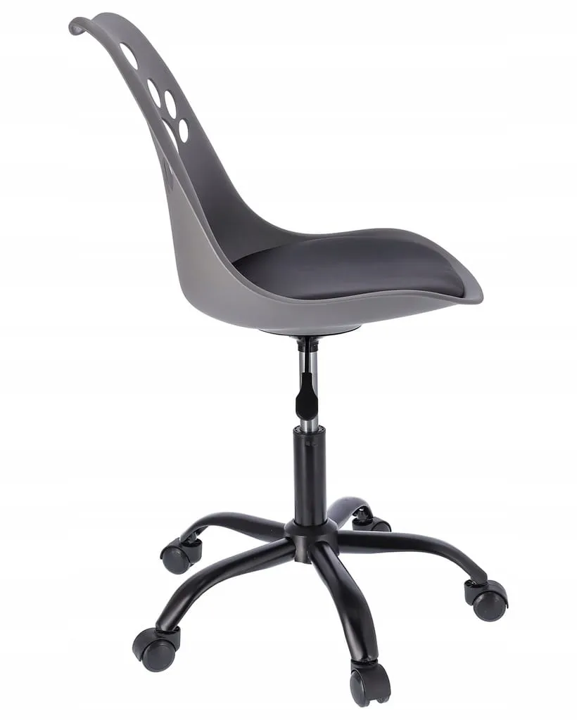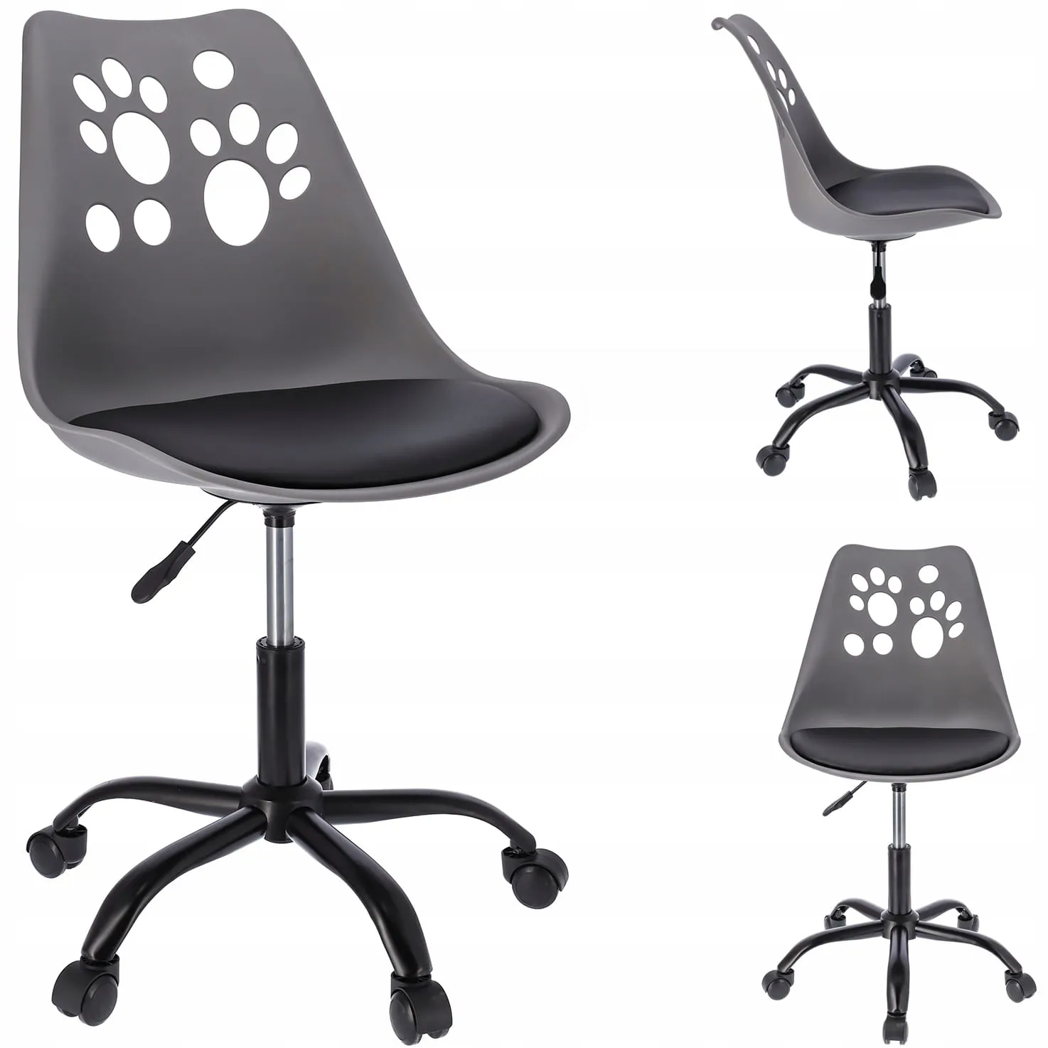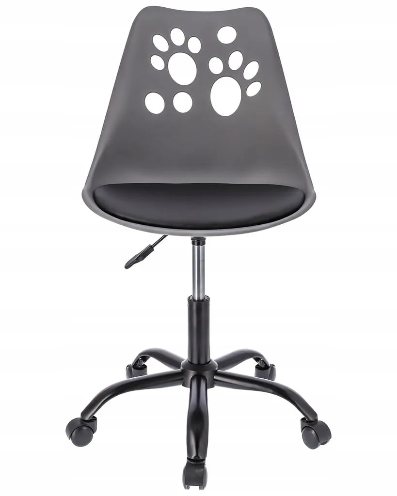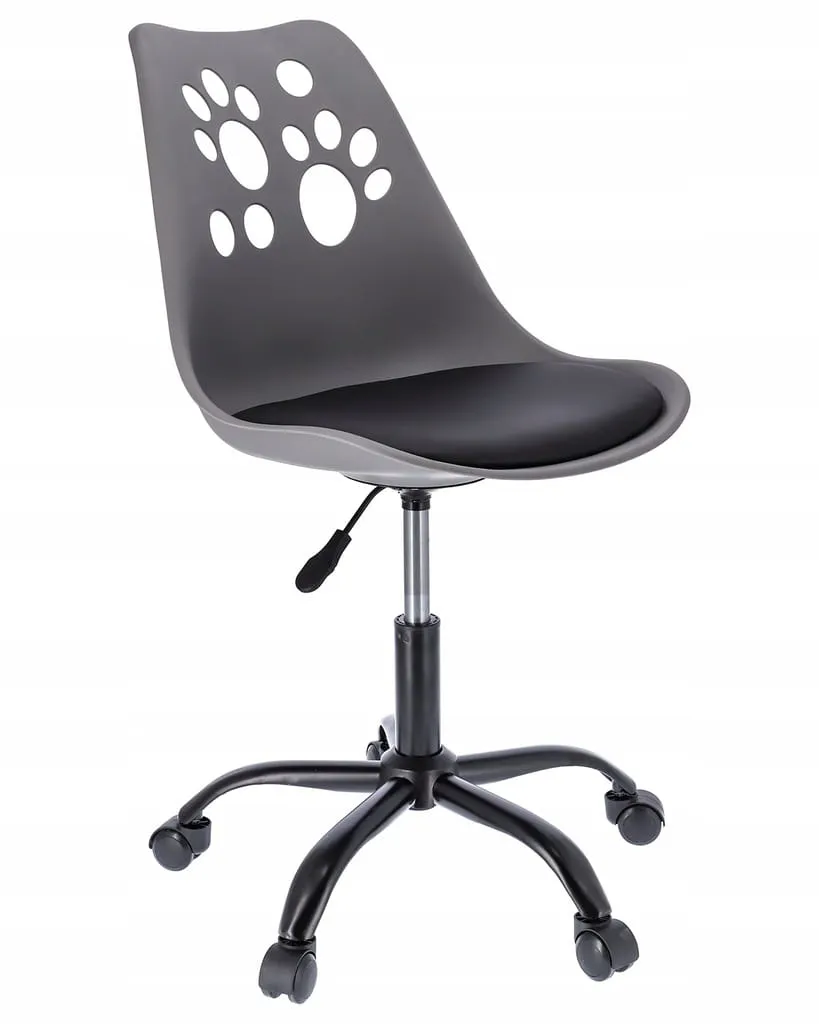 Idealnie wyprofilowane oparcie z motywem psich łapek w połączeniu z miękką poduszką umieszczoną na siedzisku zapewnia wygodę, a pięcioramienna podstawa zakończona niewielkimi kółkami daje dużą stabilność oraz zabezpiecza powierzchnię przed zarysowaniem. Krzesło posiada siłownik, który pozwala dostosować wysokość siedzenia do wymaganych potrzeb.