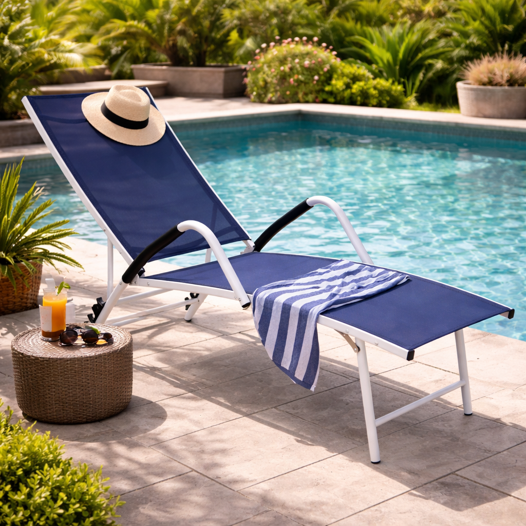 Wyprofilowane siedzisko z miękkiego materiału dopasowuje się do ciała, zapewniając wygodę podczas opalania, czytania czy popołudniowego odpoczynku.