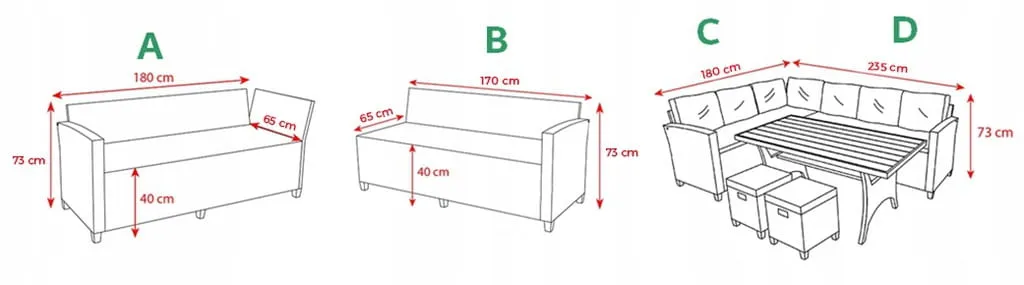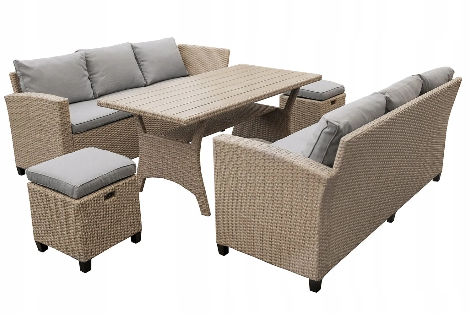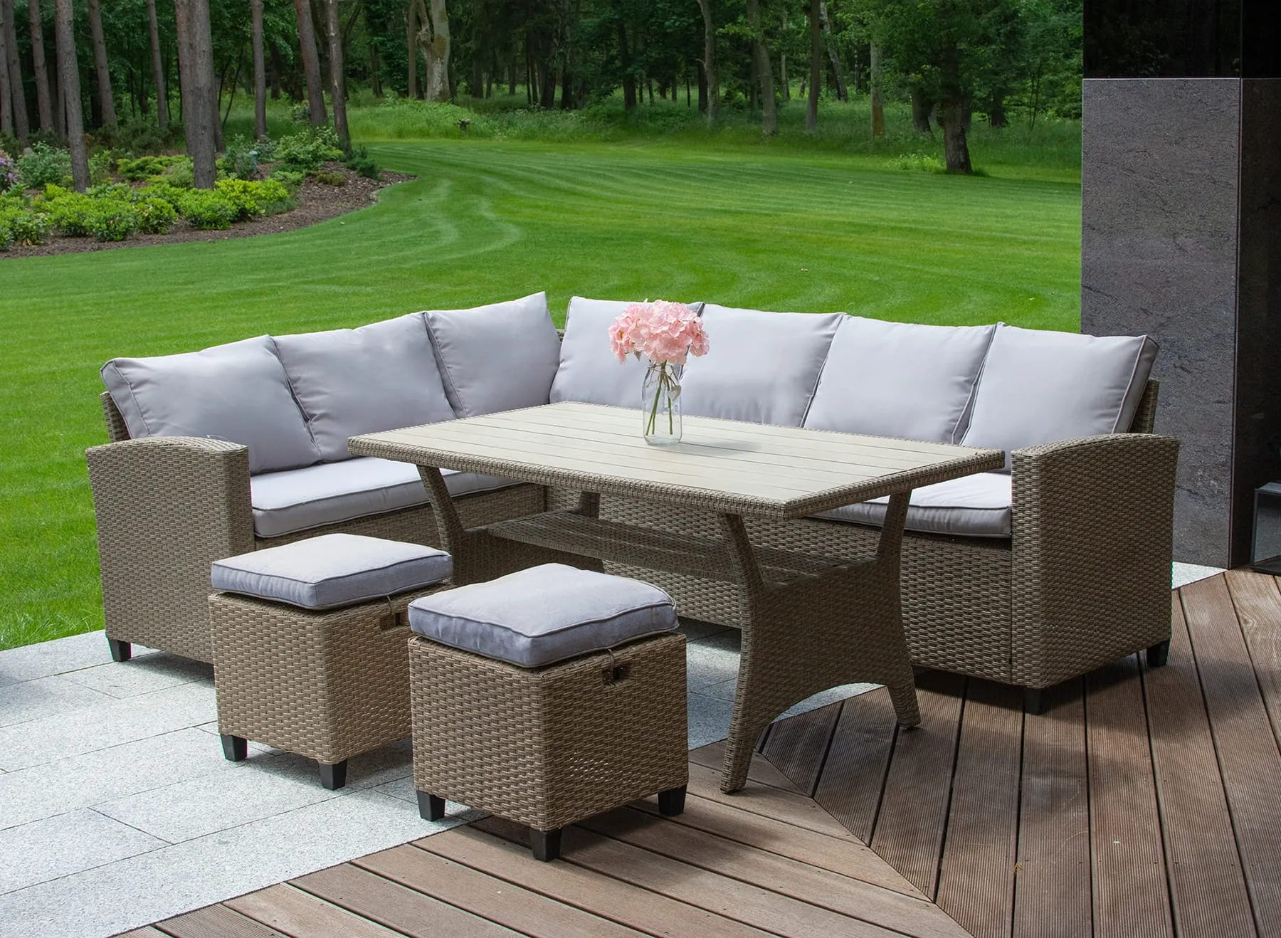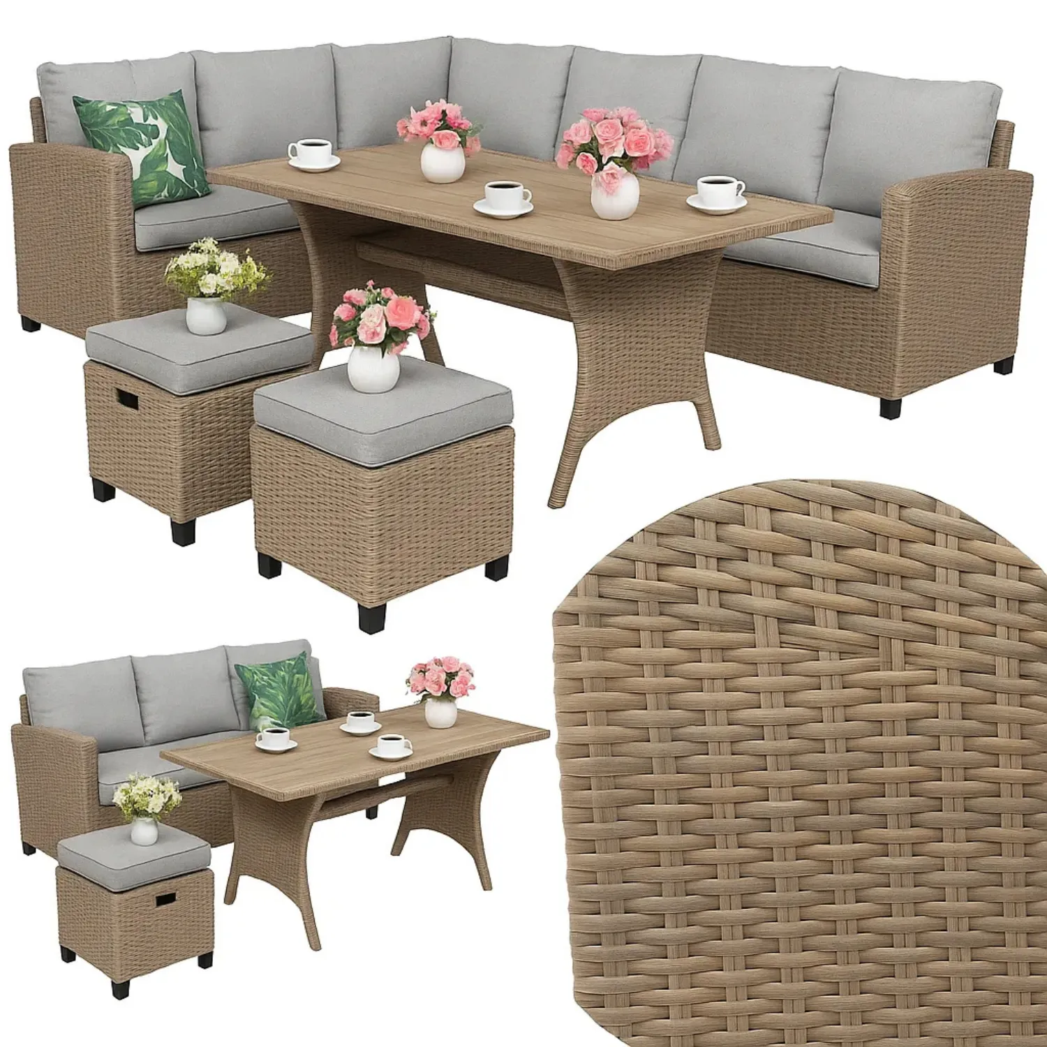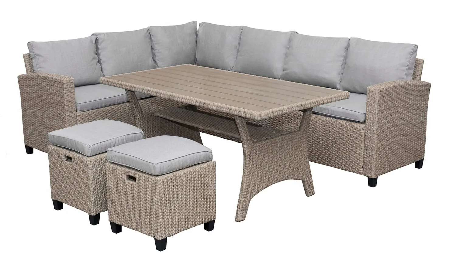 Dzięki zastosowaniu odpornego na czynniki pogodowe oraz wodę technorattanu PE zestaw ten jest łatwy do czyszczenia, odporny i odpowiedni do codziennego użytkowania. Jego mocne, stalowe elementy są niezwykle trwałe. Nogi mebli wykonane są z tworzywa imitującego drewno, a narożnik jest modułowy i lekki, można go więc swobodnie przestawiać i dopasować do dowolnego otoczenia. Grube poduszki i stabilne pufy gwarantują wygodę użytkowania.