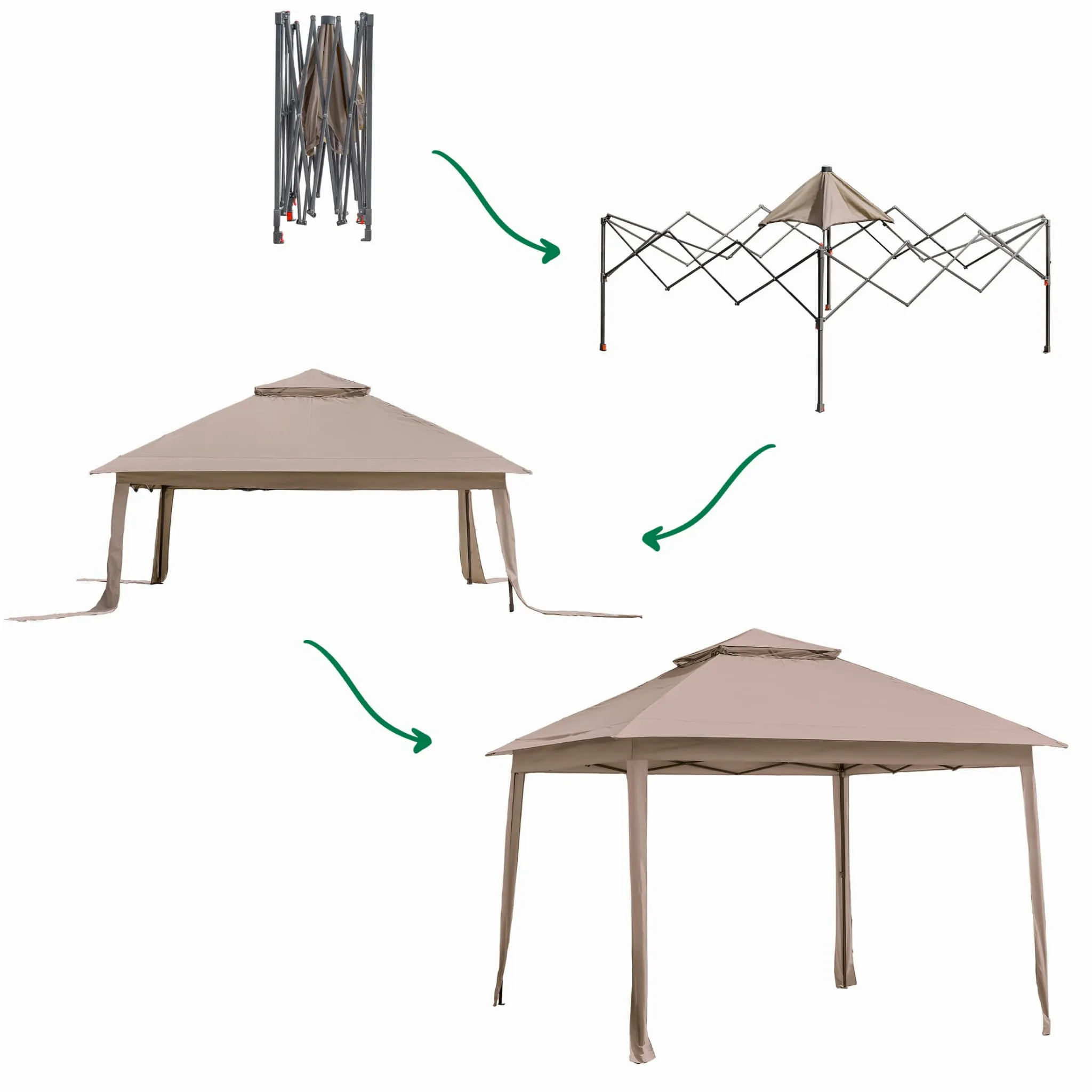 - Szybki montaż – system pop-up: Pawilon rozkłada się automatycznie, dzięki mechanizmowi typu „pop-up”, co pozwala na błyskawiczne przygotowanie przestrzeni bez użycia narzędzi.