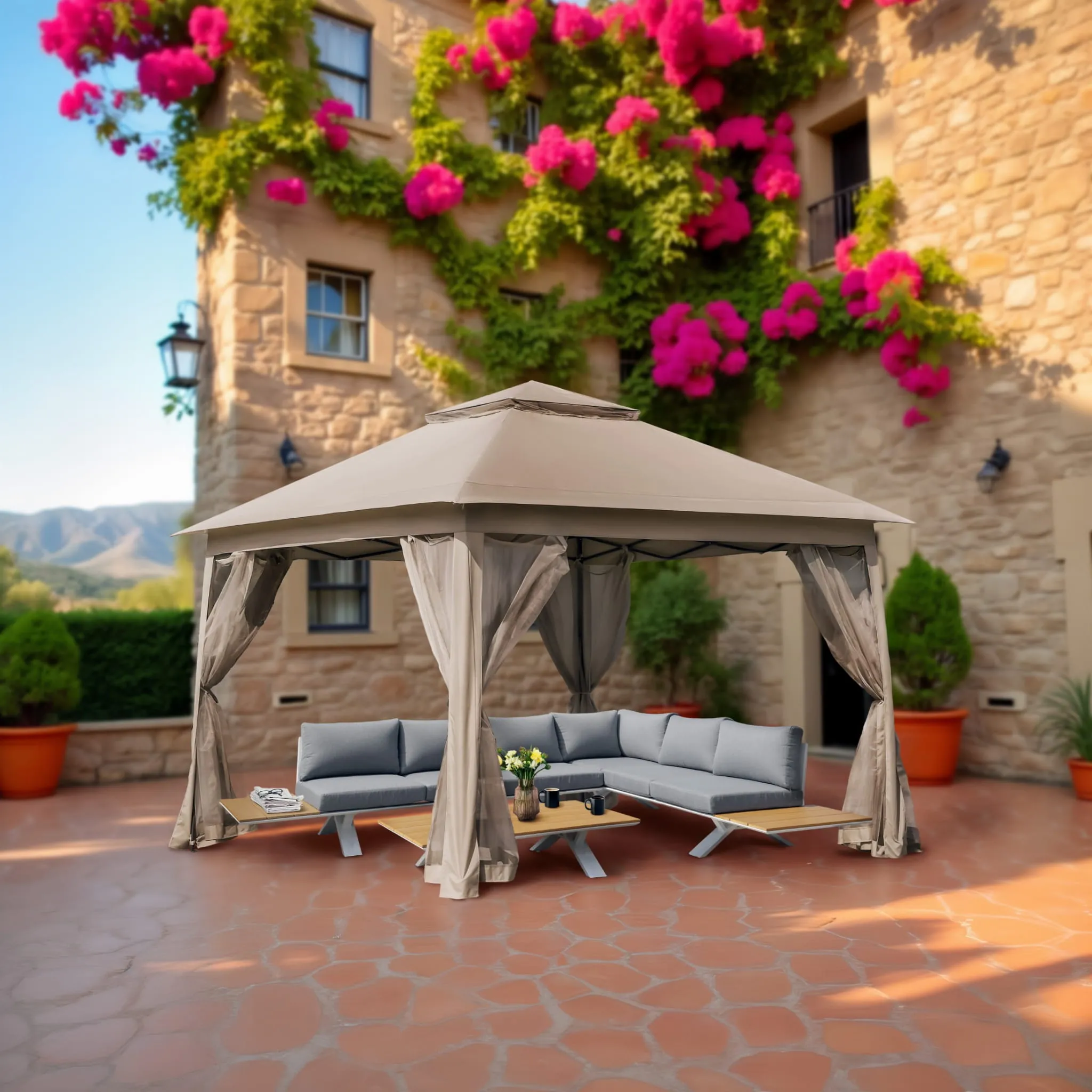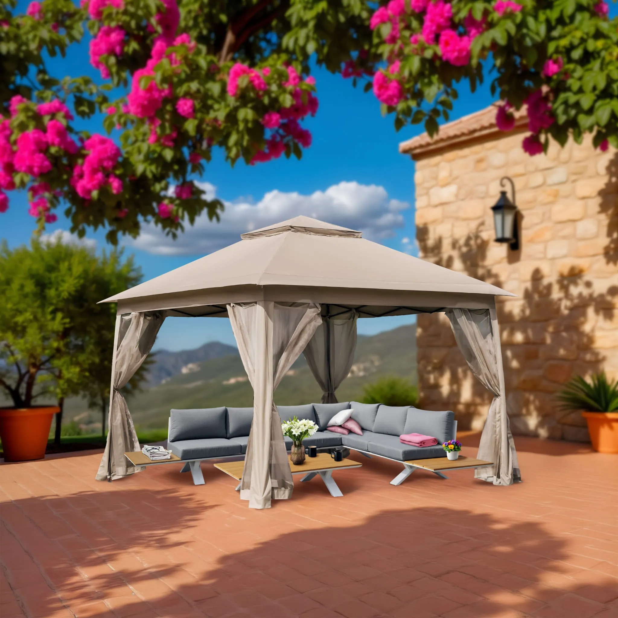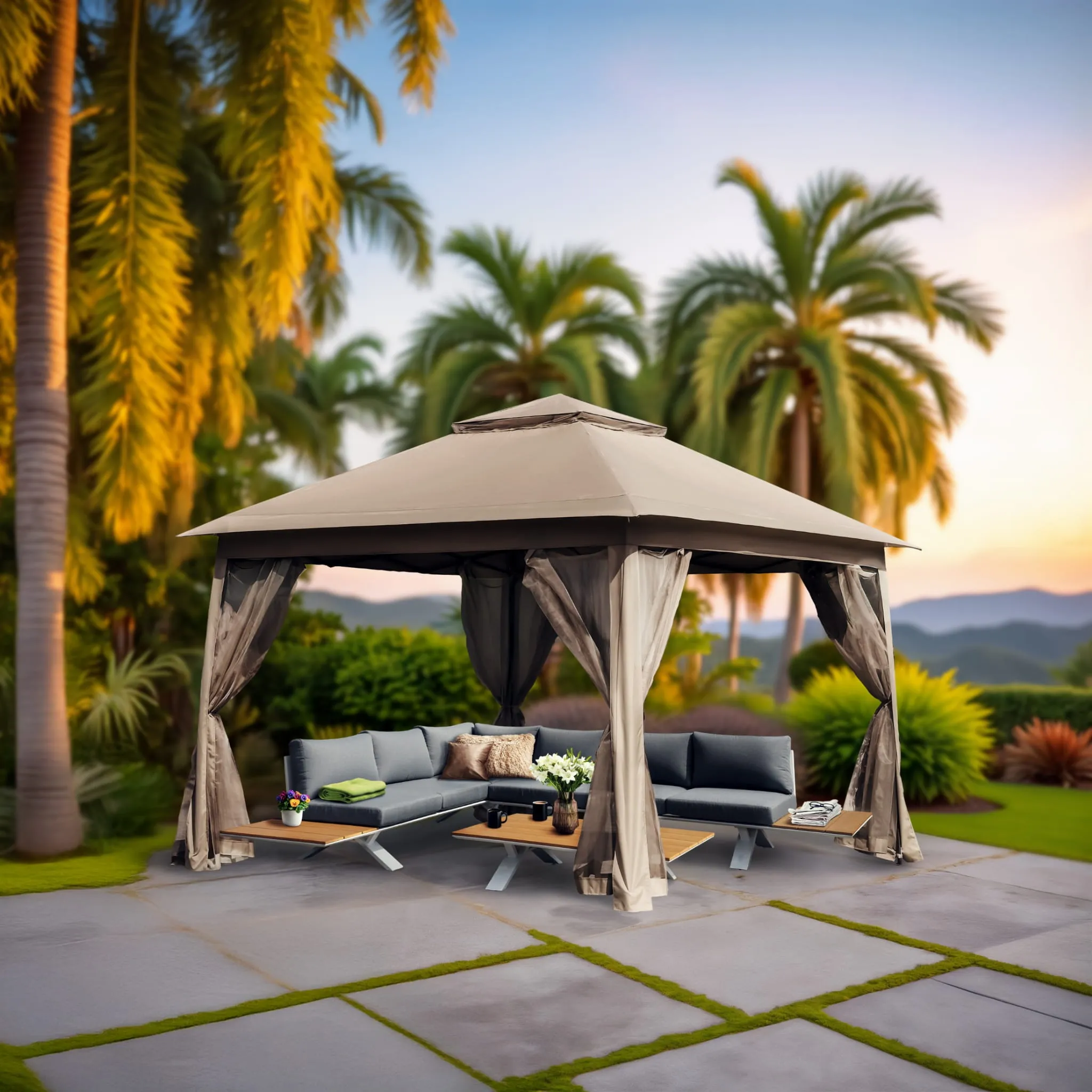 Dzięki automatycznemu systemowi składania typu pop-up rozstawisz go w kilka chwil, a cztery ściany z moskitierami zapewnią komfort i ochronę nawet w najbardziej upalne dni. To praktyczne i estetyczne rozwiązanie, które odmieni Twój ogród lub taras.