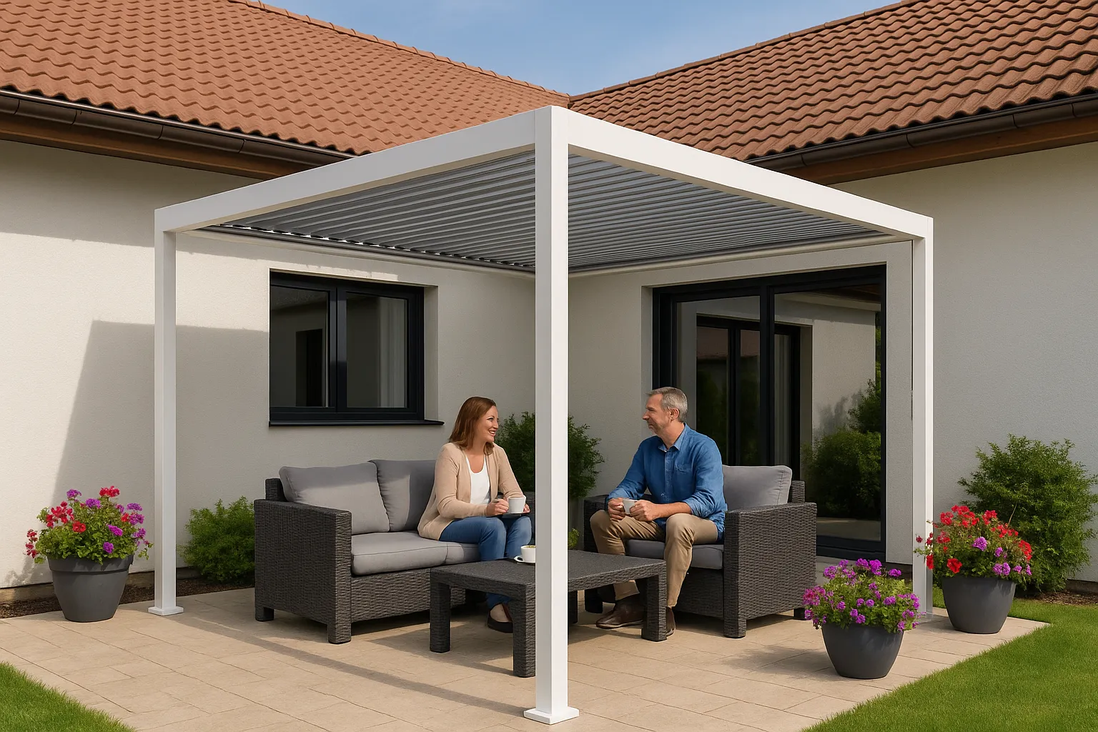 Jej minimalistyczny design i solidna konstrukcja nie tylko doskonale komponują się z każdą aranżacją zewnętrzną, ale też zapewniają wyjątkowy komfort użytkowania przez cały sezon. Największym atutem pergoli jest regulowany dach – innowacyjny system obrotowych paneli pozwala precyzyjnie kontrolować dopływ światła i cienia, a także chroni przed deszczem.