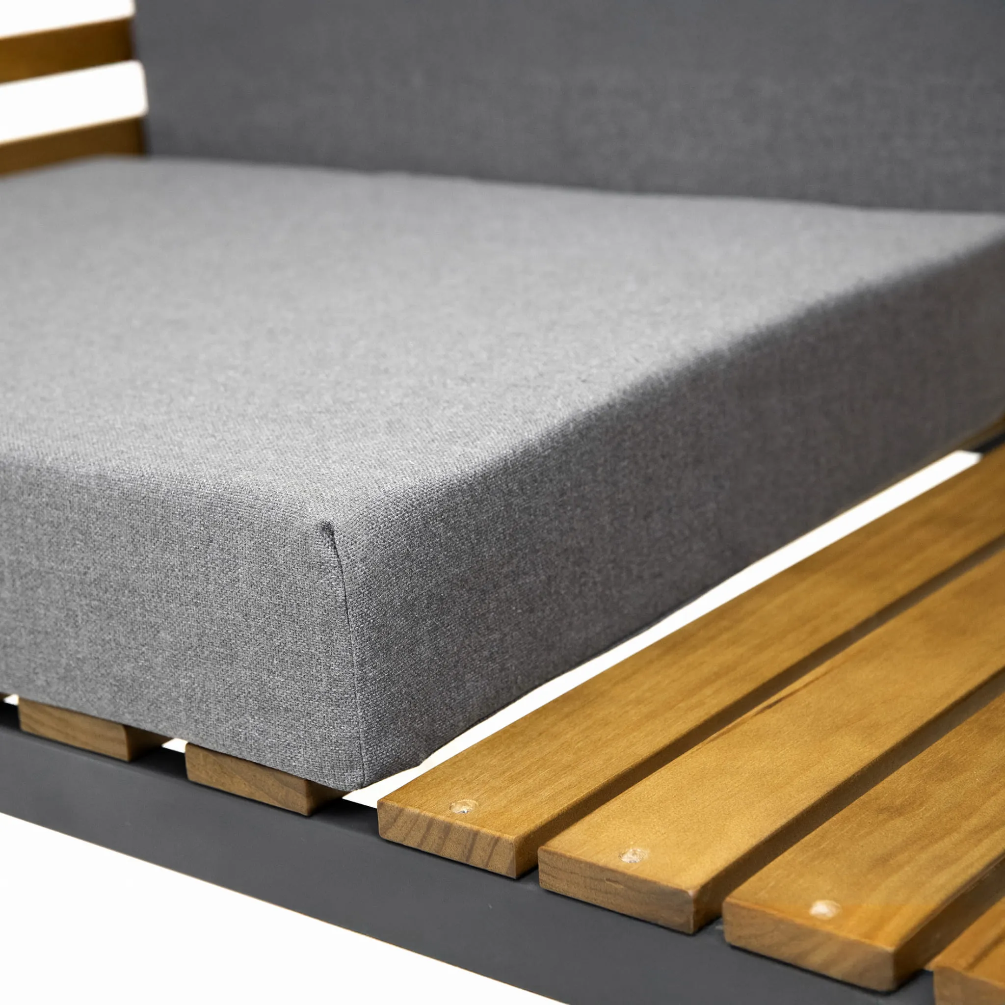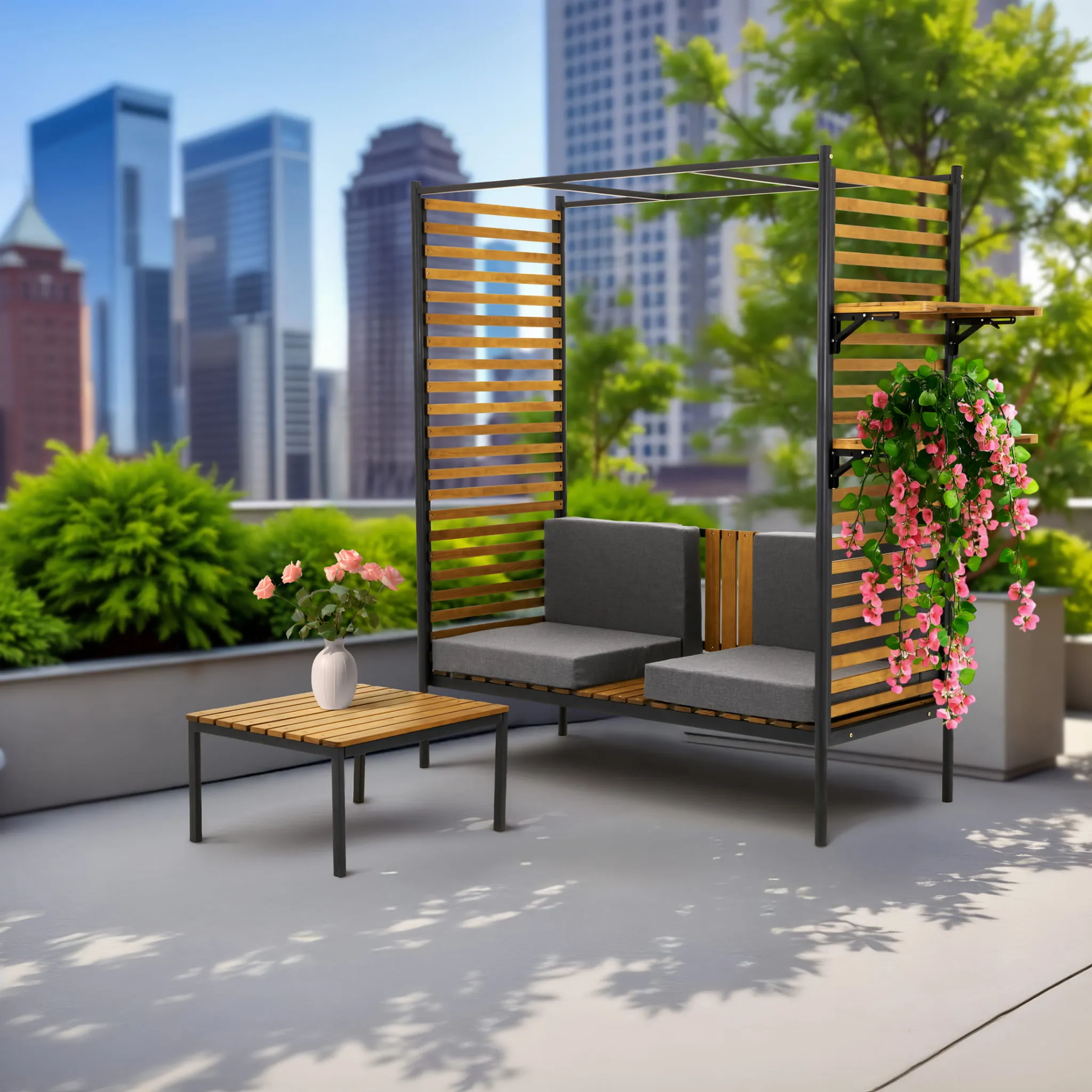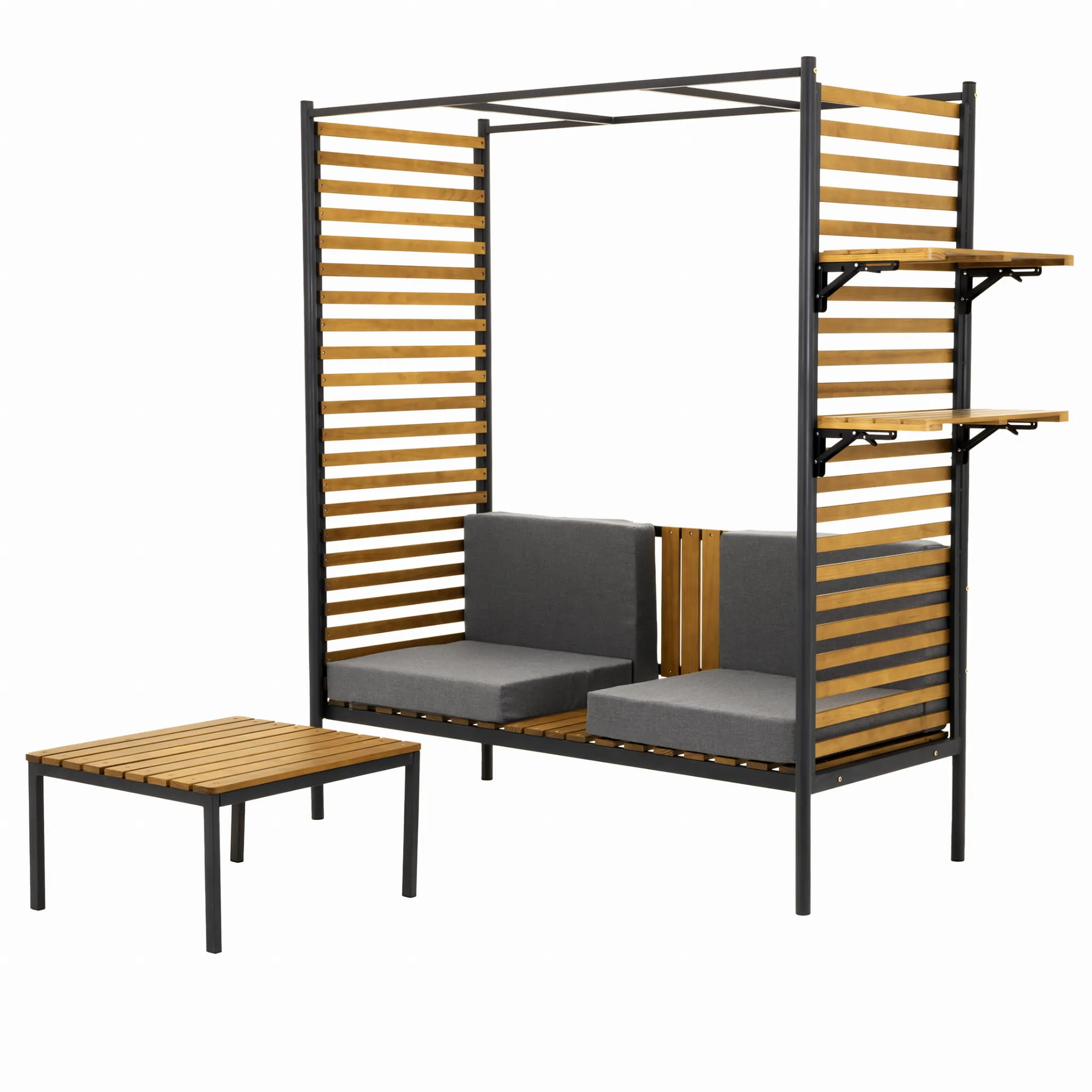 Ławka nie tylko zapewnia wygodę, dzięki wysokiemu oparciu, ale też kryje w sobie sprytnie wkomponowane półki, na których możesz ustawić kwiaty, książki, lampiony – wszystko, co uczyni to miejsce naprawdę twoim.