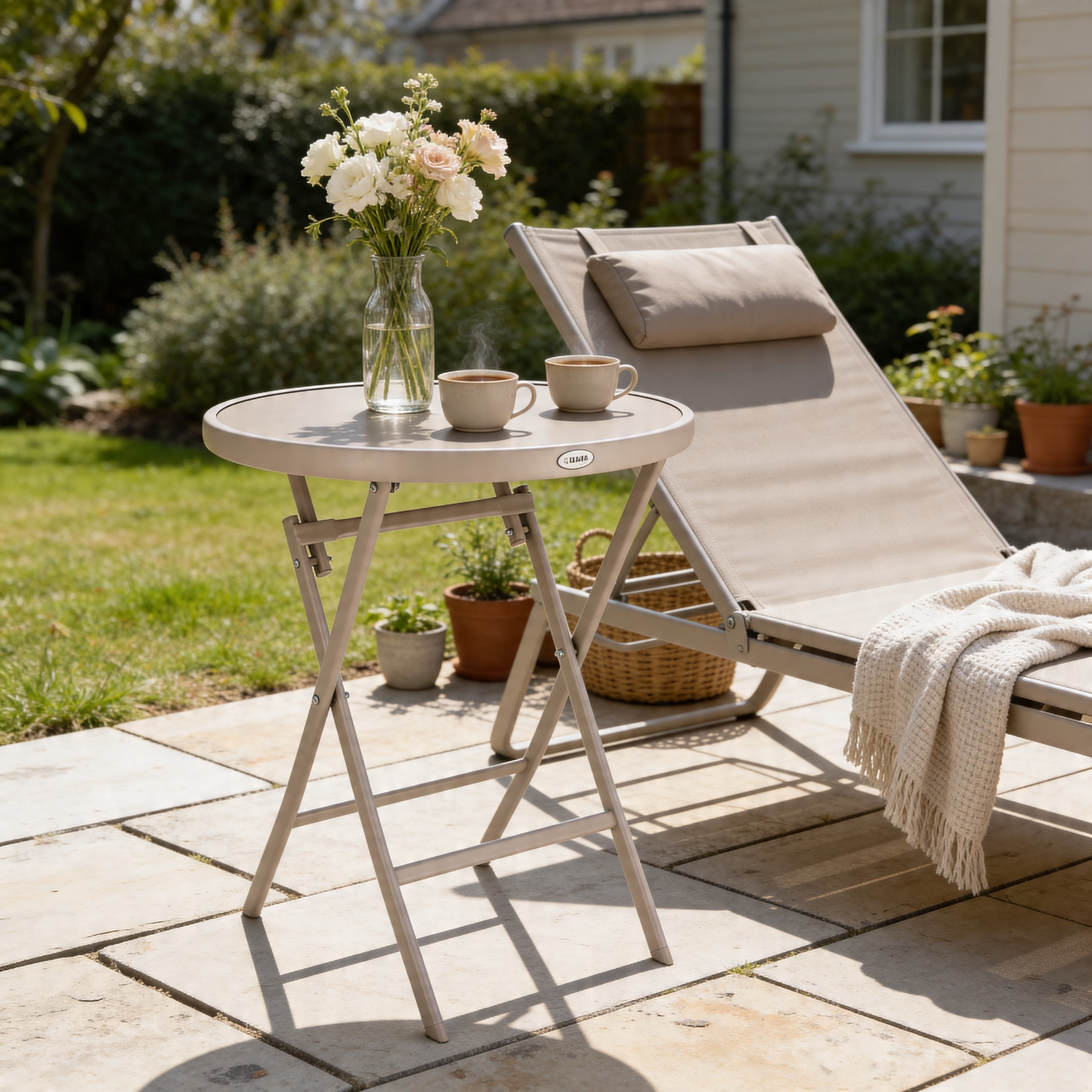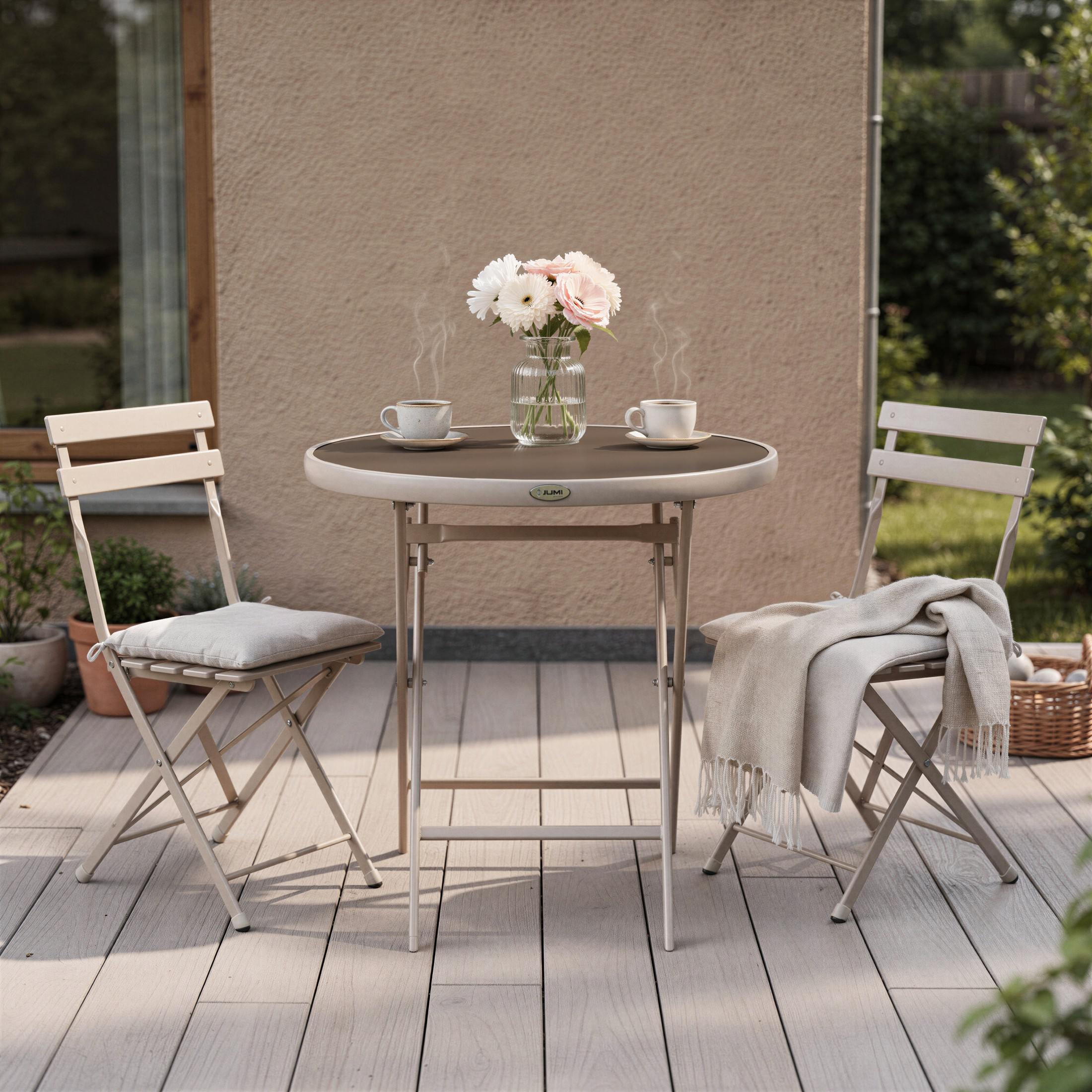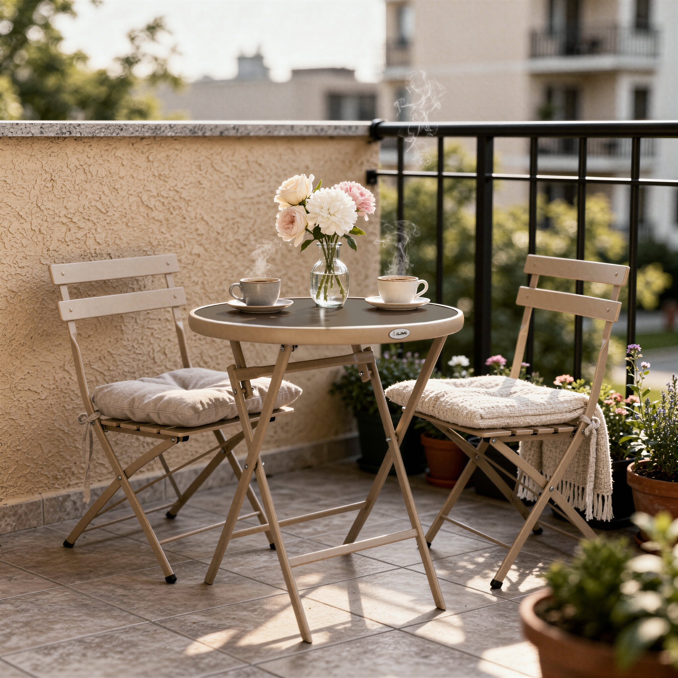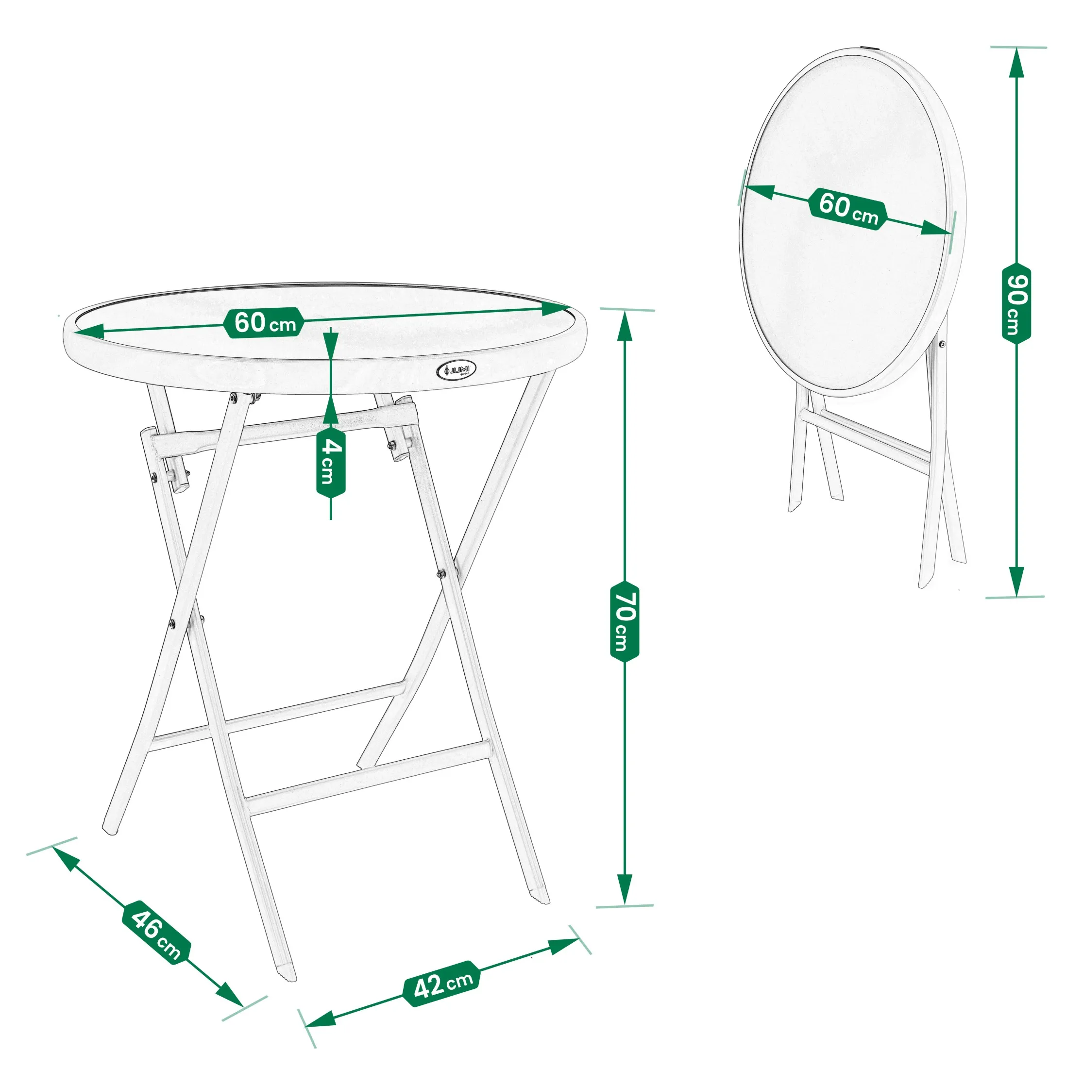 Konstrukcja jest składana, dzięki czemu stolik można w kilka sekund złożyć do formy płaskiej i wygodnie przechowywać lub przenosić. Mechanizm składania działa lekko i stabilnie. To rozwiązanie, które realnie oszczędza miejsce na balkonie, w schowku, w garażu lub w komórce lokatorskiej.