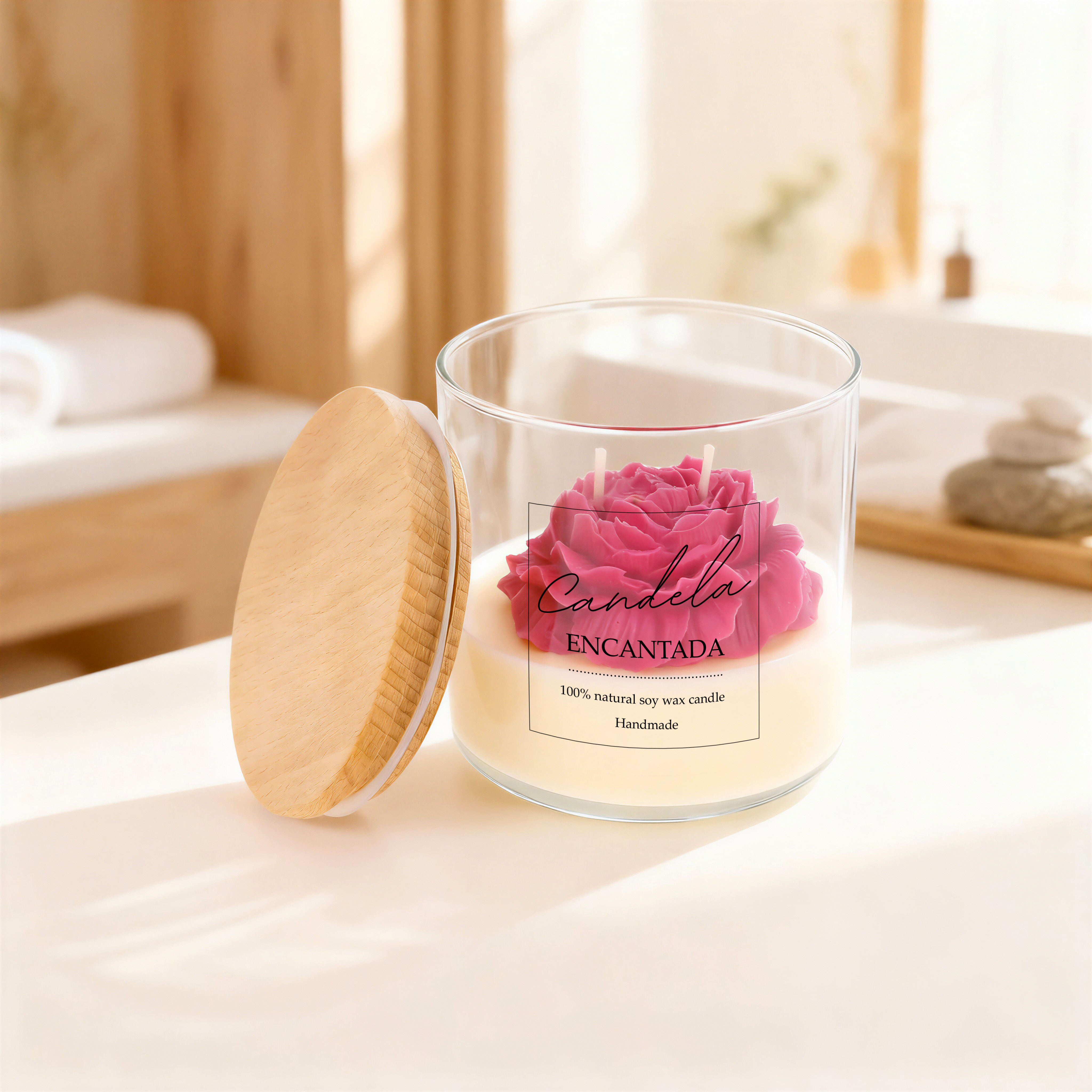Wyjątkowa świeca sojowa z dekoracyjną, kwiatową formą, zatopioną w naturalnym wosku. Intensywny kolor piwonii kontrastuje z mleczną bielą wosku, tworząc efektowną, a jednocześnie subtelną kompozycję. Całość zamknięta jest w prostym, szklanym naczyniu z drewnianą pokrywą. To idealny wybór dla miłośników estetycznych detali oraz doskonały pomysł na prezent – elegancki, naturalny, ponadczasowy.
