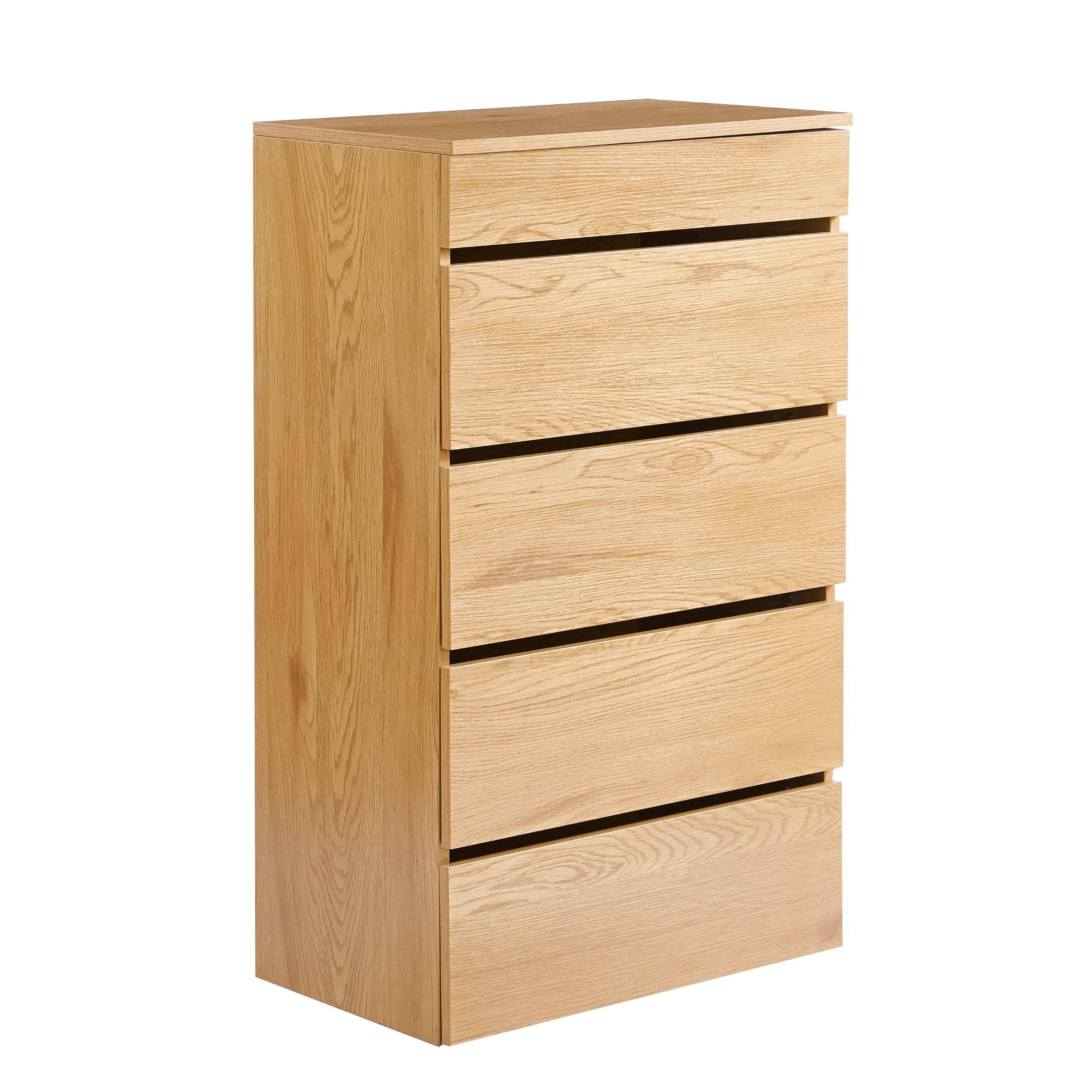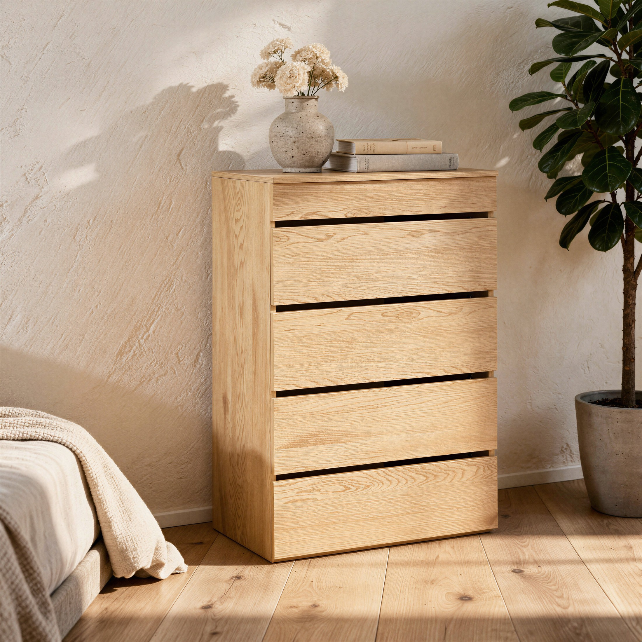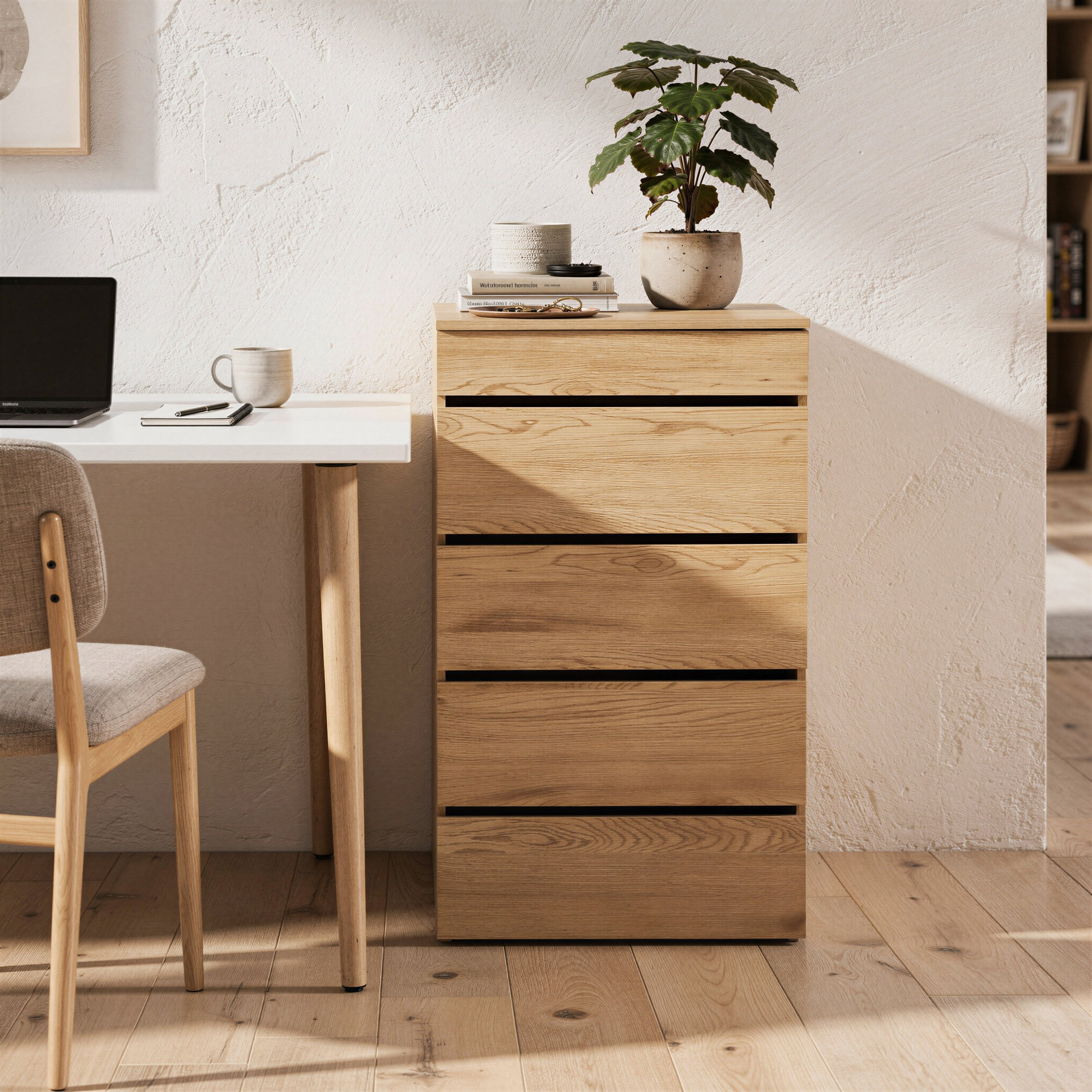 Wykonana z płyty laminowanej w kolorze naturalnego dębu, prezentuje się ciepło i ponadczasowo.