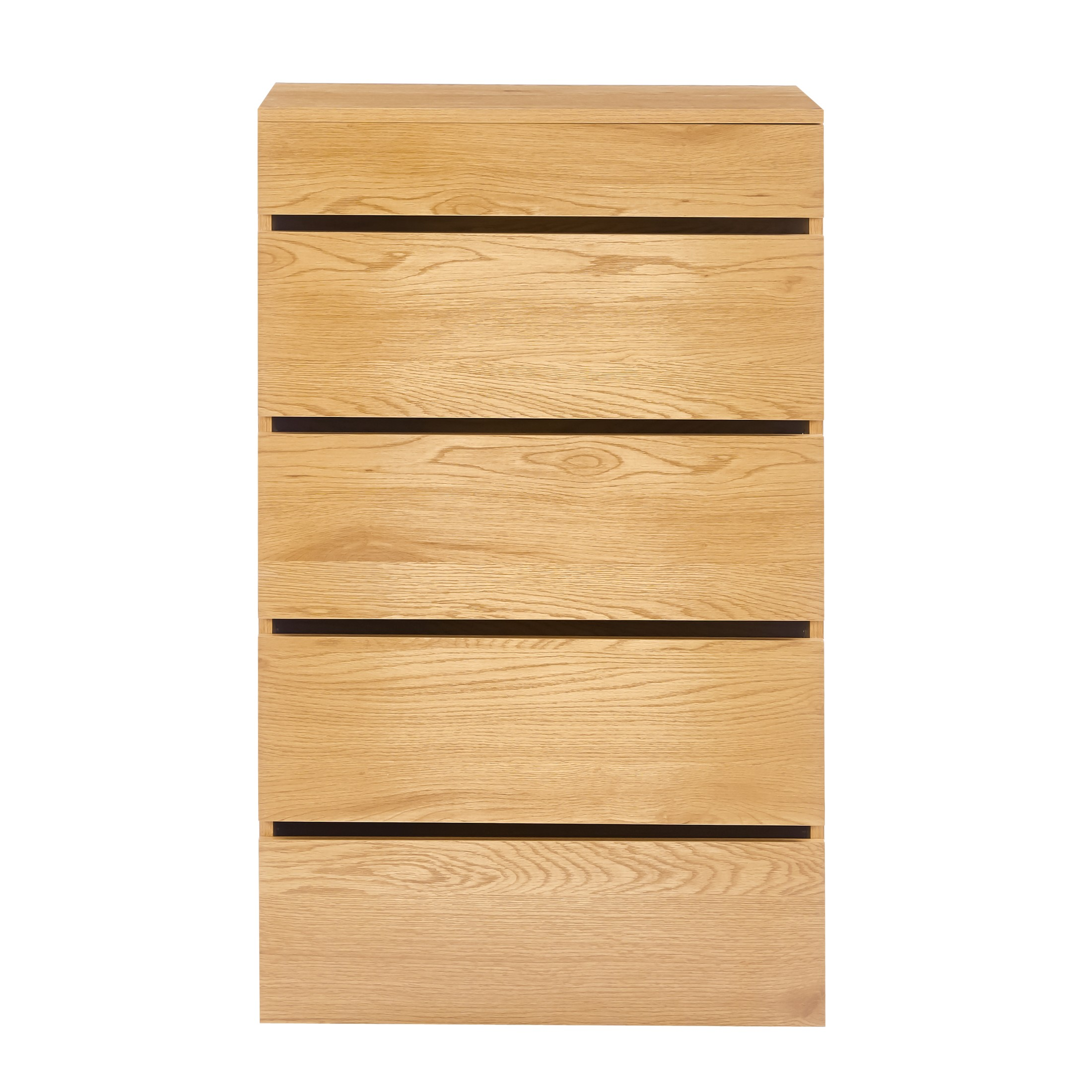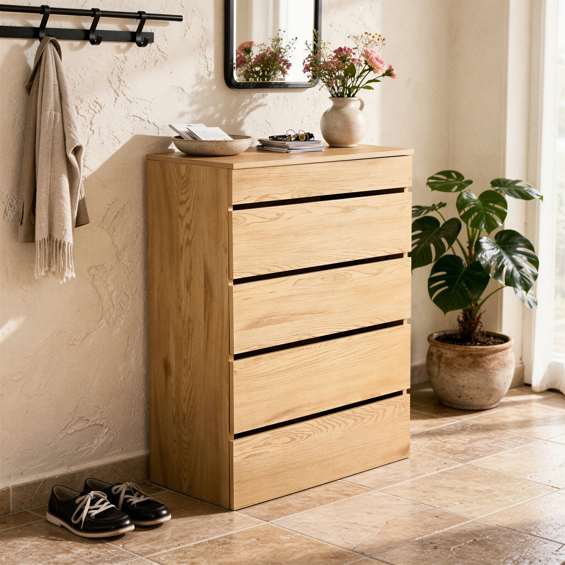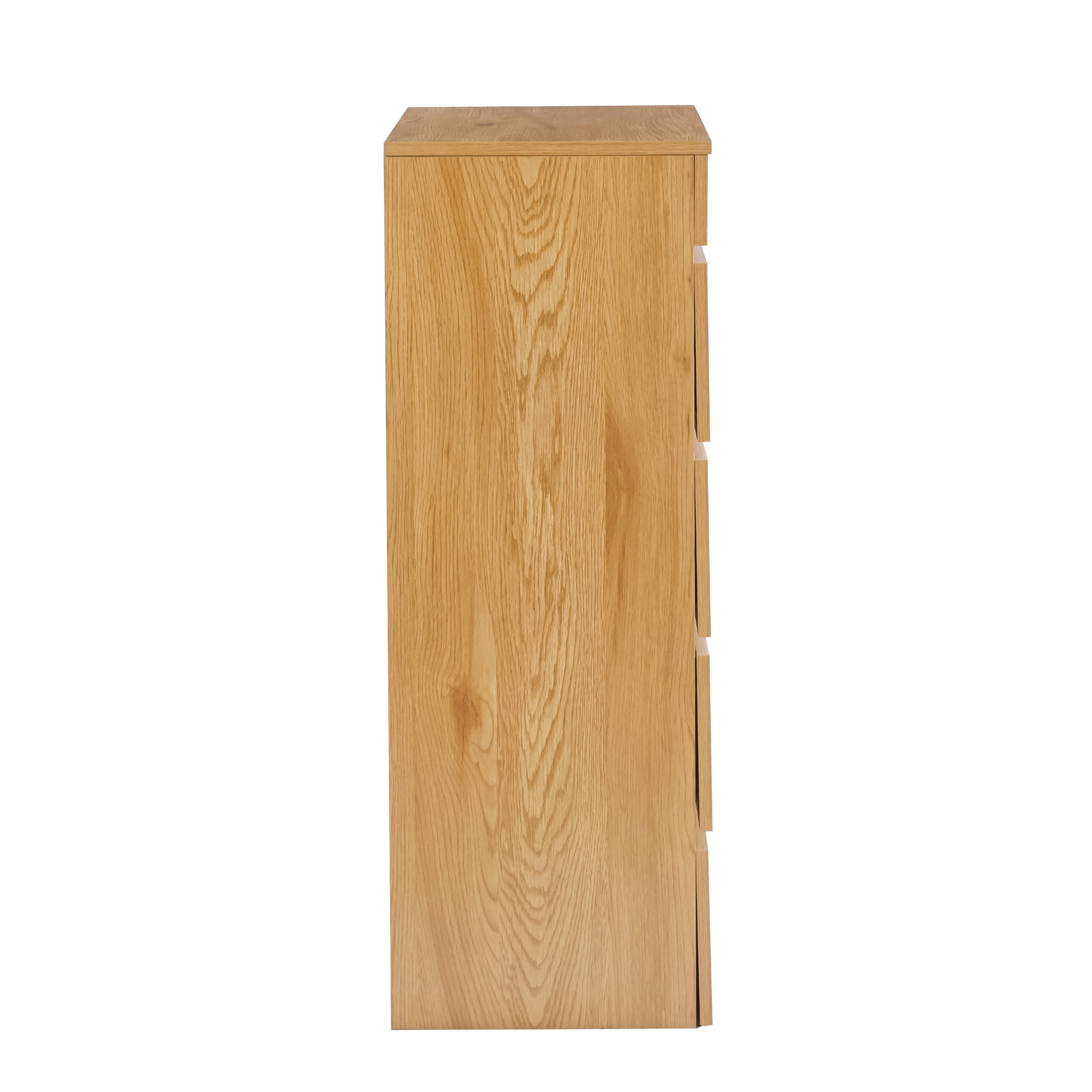 Szafka na buty z otwieranym frontem w kolorze naturalnego dębu łączy elegancję z praktycznym designem. Cztery uchylne półki i górny schowek zapewniają maksymalne wykorzystanie przestrzeni, a solidna płyta laminowana gwarantuje trwałość. Stabilna konstrukcja o maksymalnym obciążeniu b sprawdzi się w każdym przedpokoju.