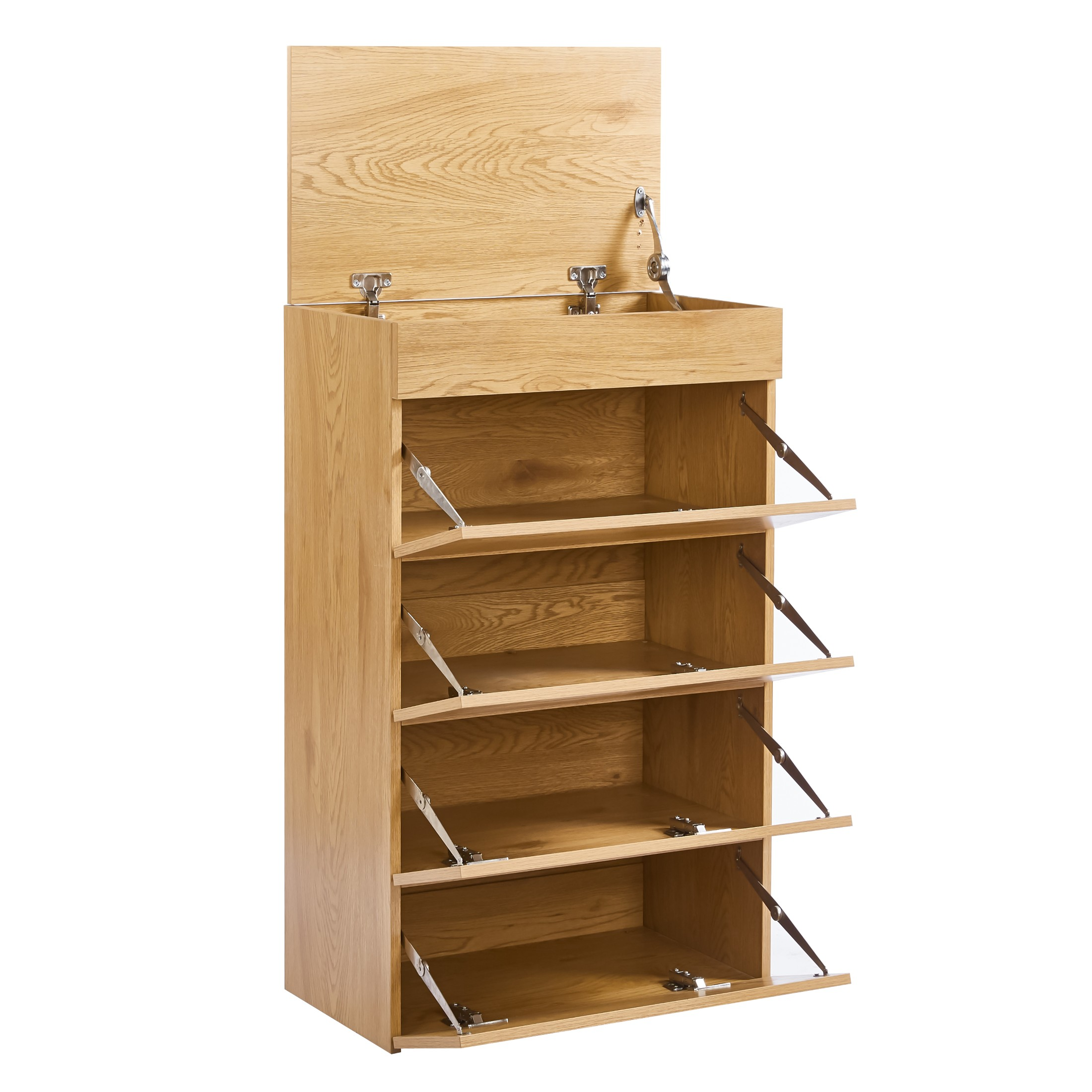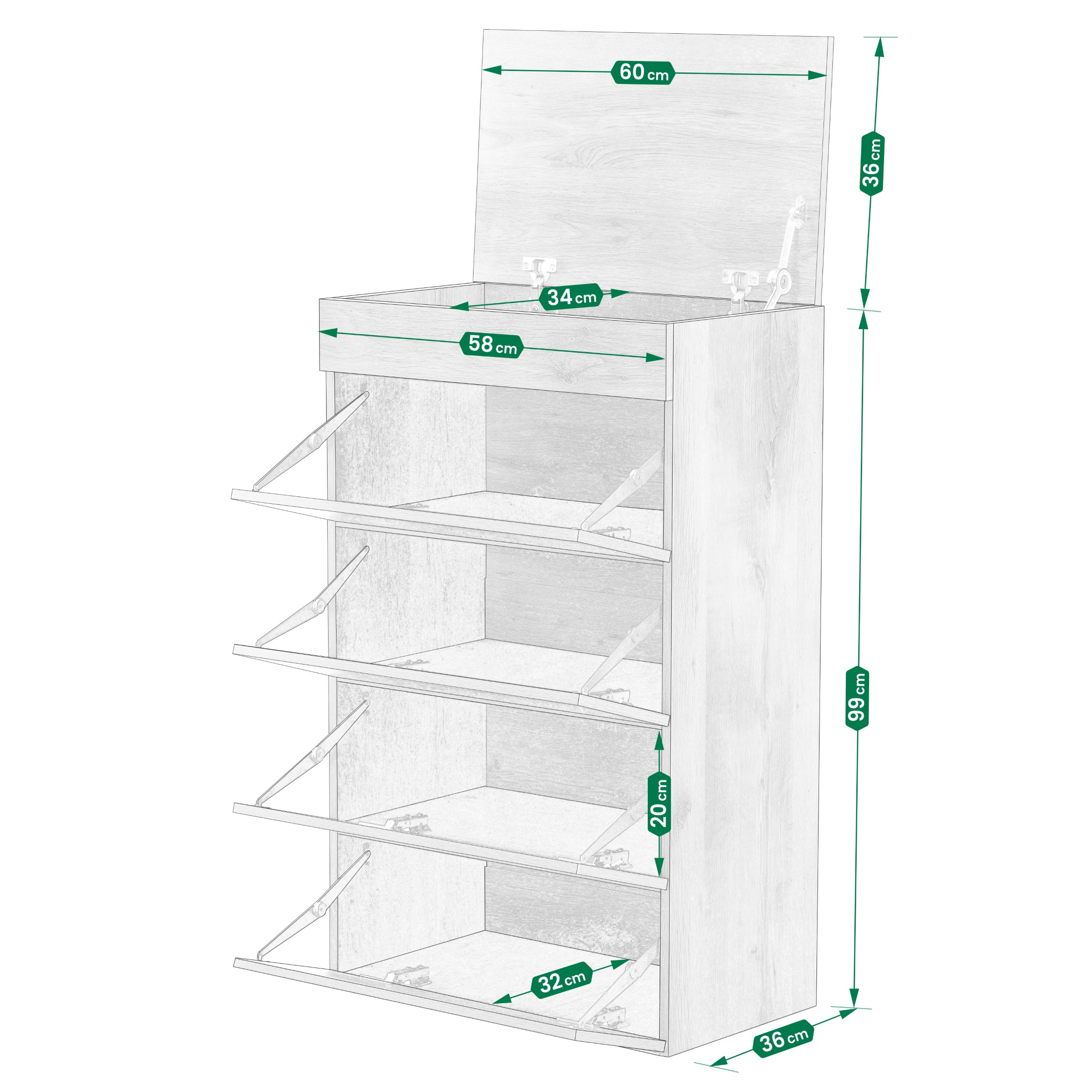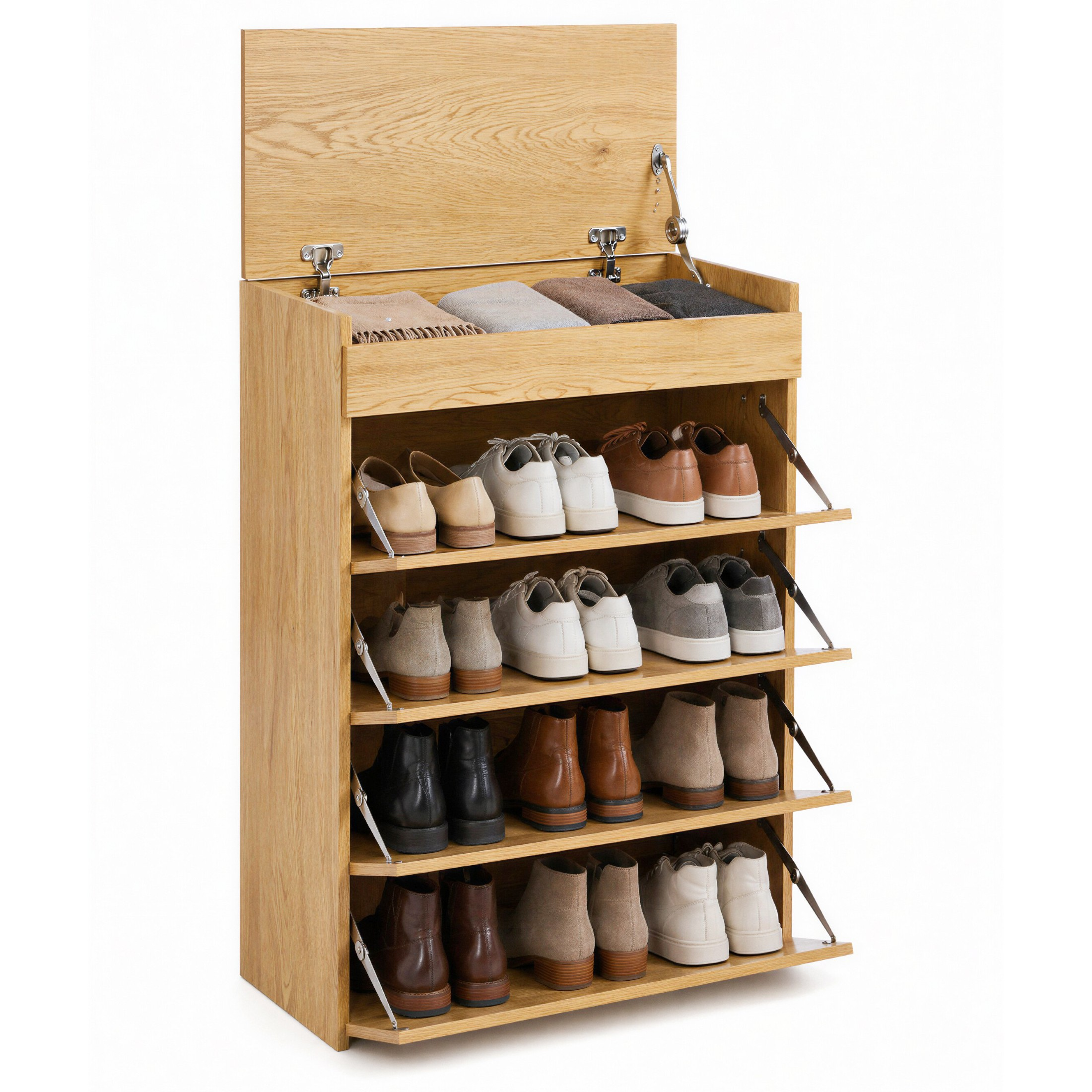 Cztery uchylne półki zapewniają wygodny dostęp do obuwia, a górna klapa z metalowymi zawiasami kryje dodatkowy schowek na akcesoria – idealny na szale, czapki czy rękawiczki.
