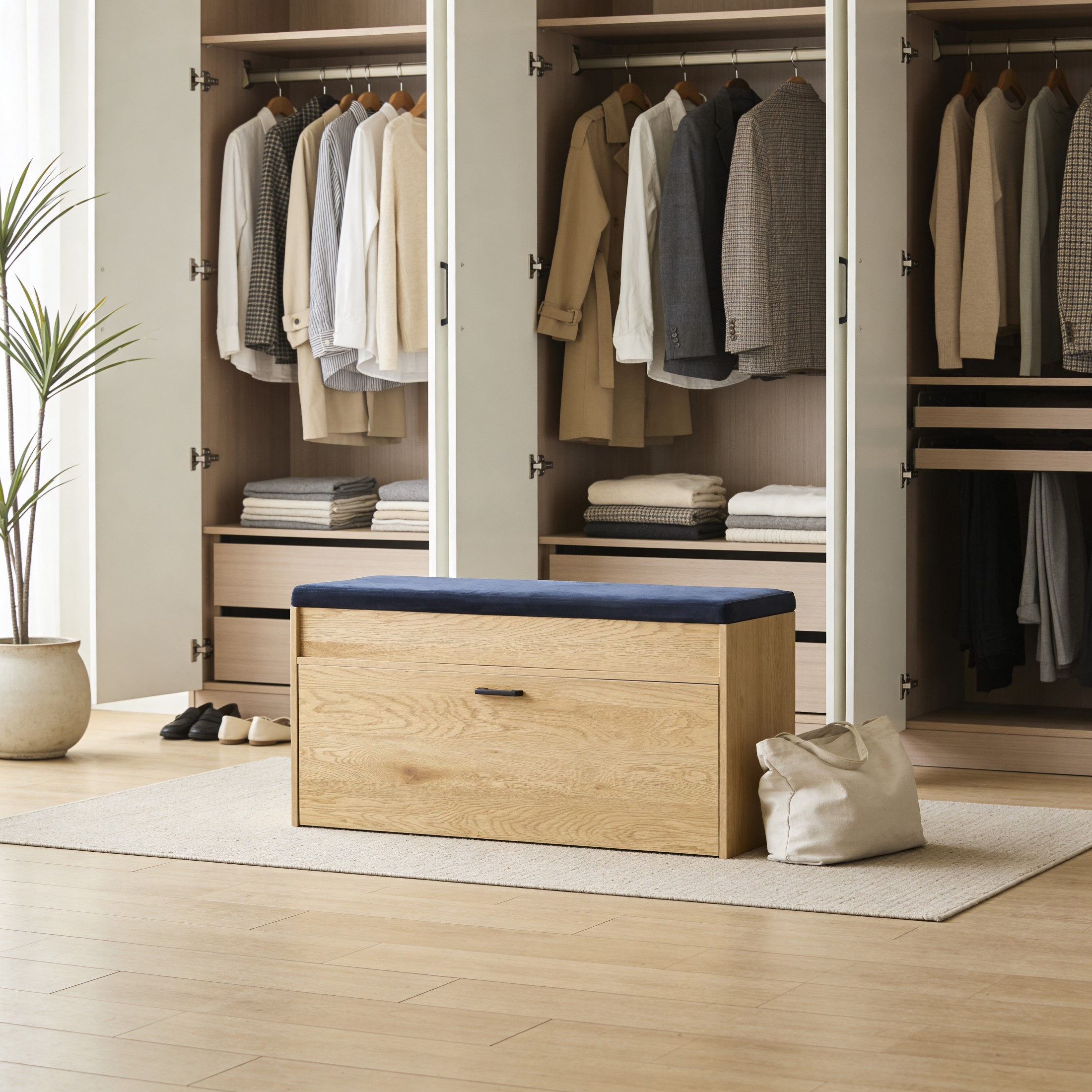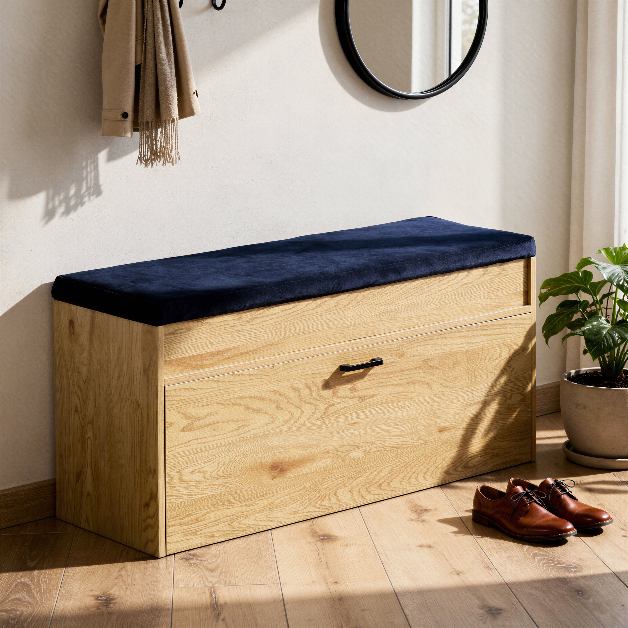 Stylowa i funkcjonalna szafka na buty z tapicerowanym siedziskiem to idealne rozwiązanie do przedpokoju, garderoby lub korytarza.