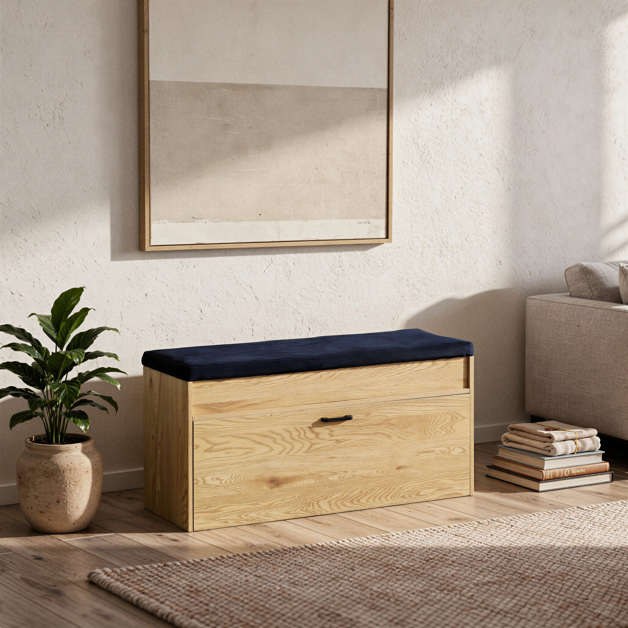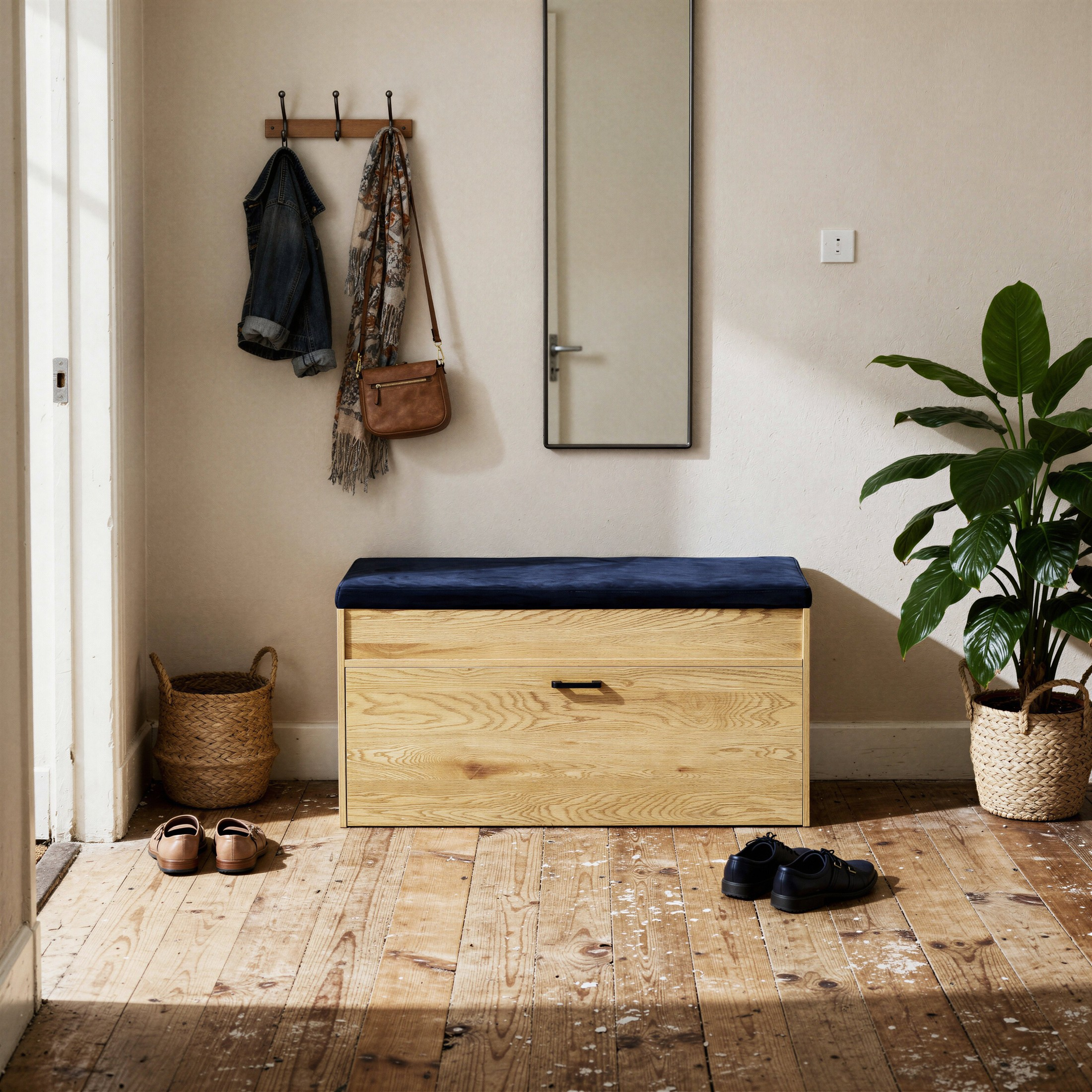Łączy w sobie komfort, pojemność i elegancki wygląd. Górna część pełni rolę miękkiego siedziska z przyjemnym w dotyku welurem, a pod nią znajduje się praktyczny schowek na drobiazgi – idealny na czapki, szaliki czy rękawiczki.
