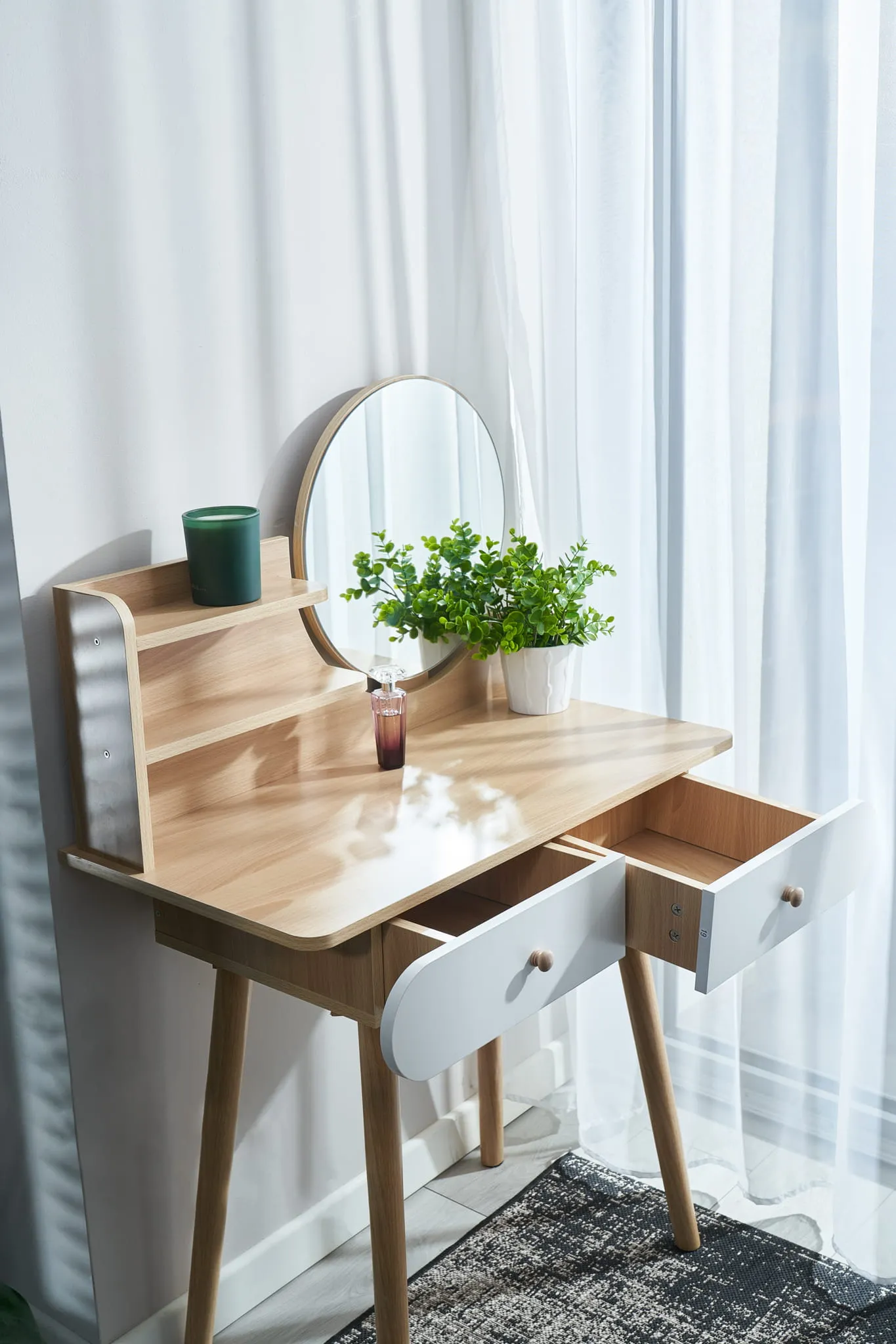Mebel doskonale pasuje do sypialni jako praktyczne miejsce do wykonania makijażu, fryzury, codziennych pielęgnacyjnych czynności kosmetycznych, a także do napisania listu czy też przechowywania wielu rozmaitych drobiazgów.