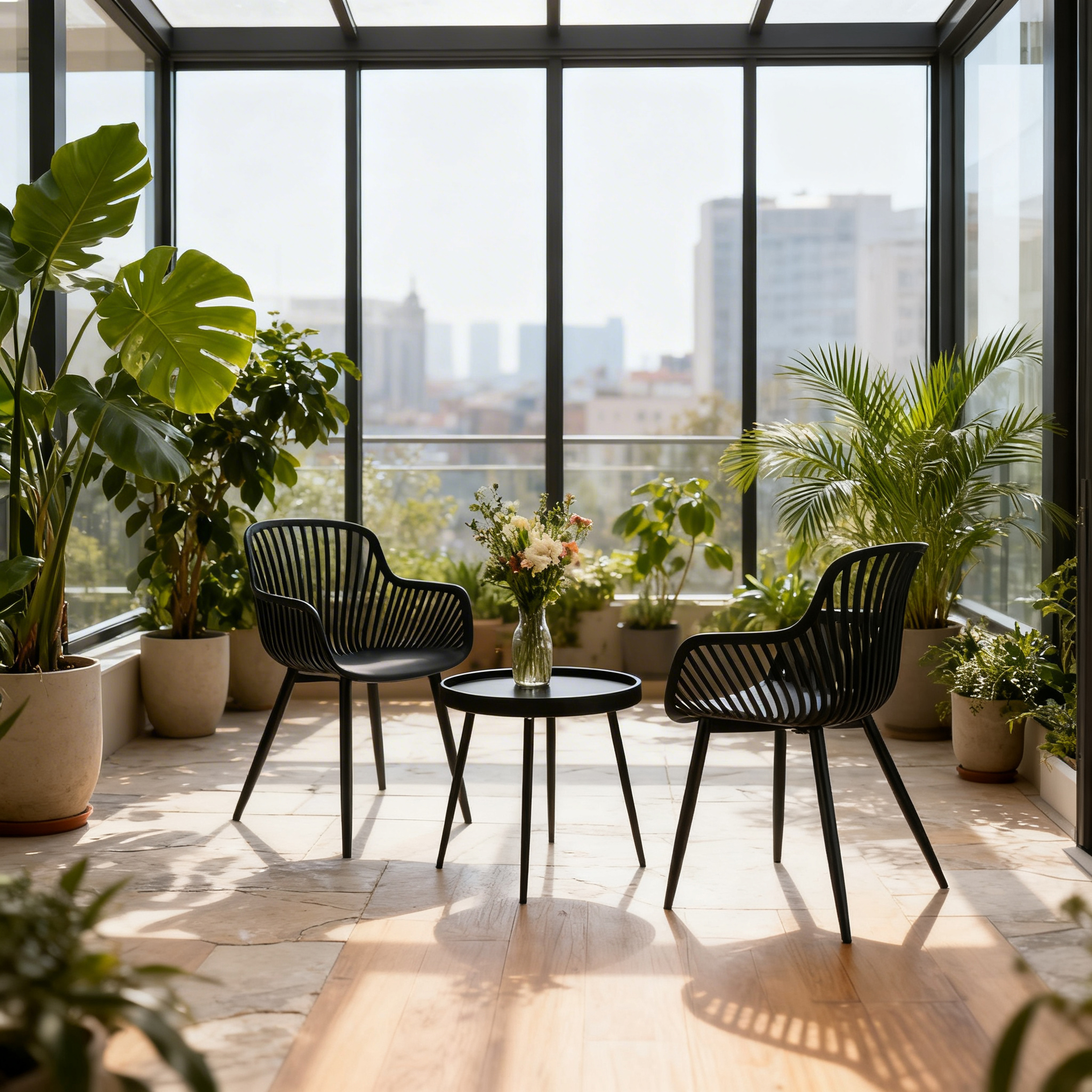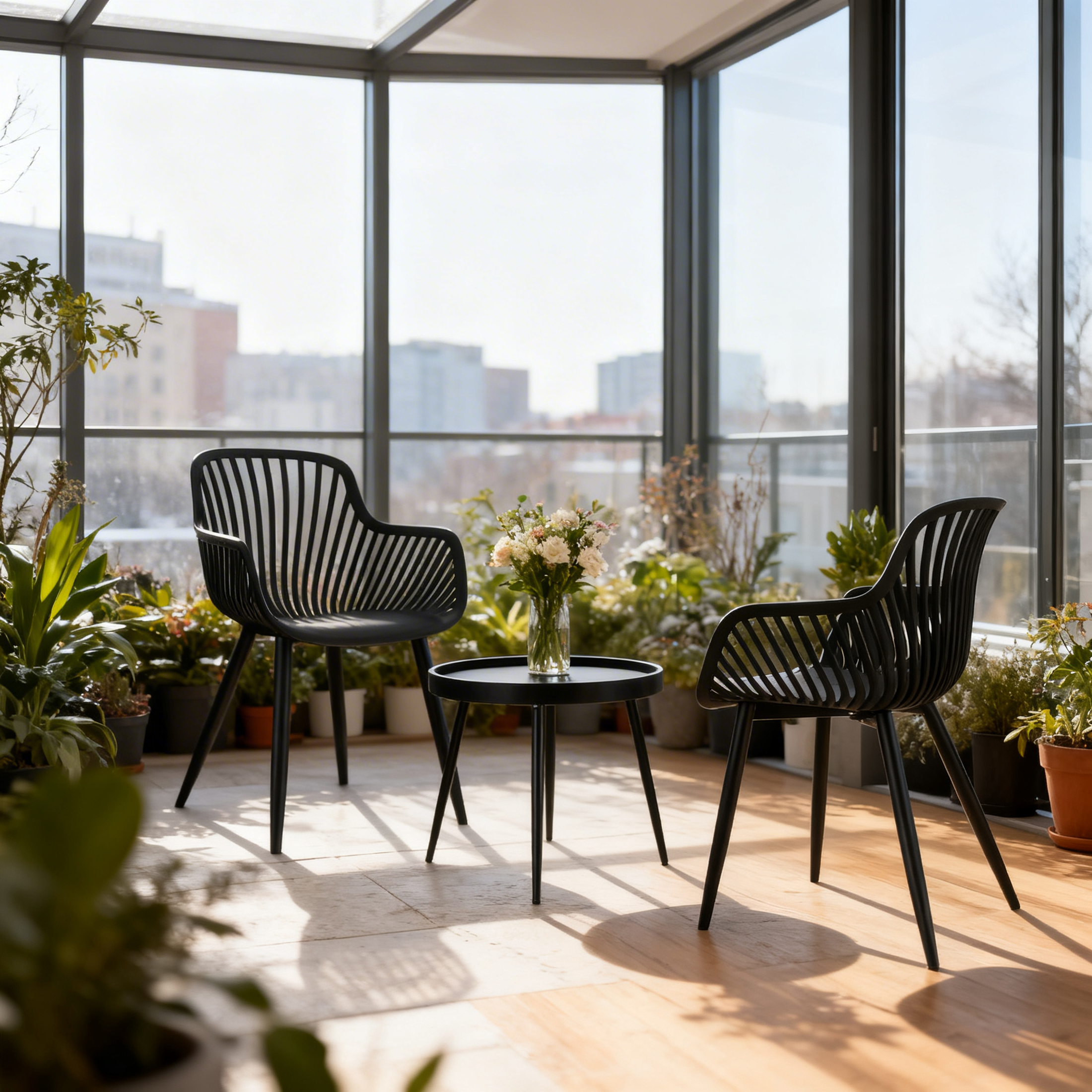 - Nowoczesny design – eleganckie, ażurowe krzesła i minimalistyczny stolik tworzą spójną, stylową całość.
