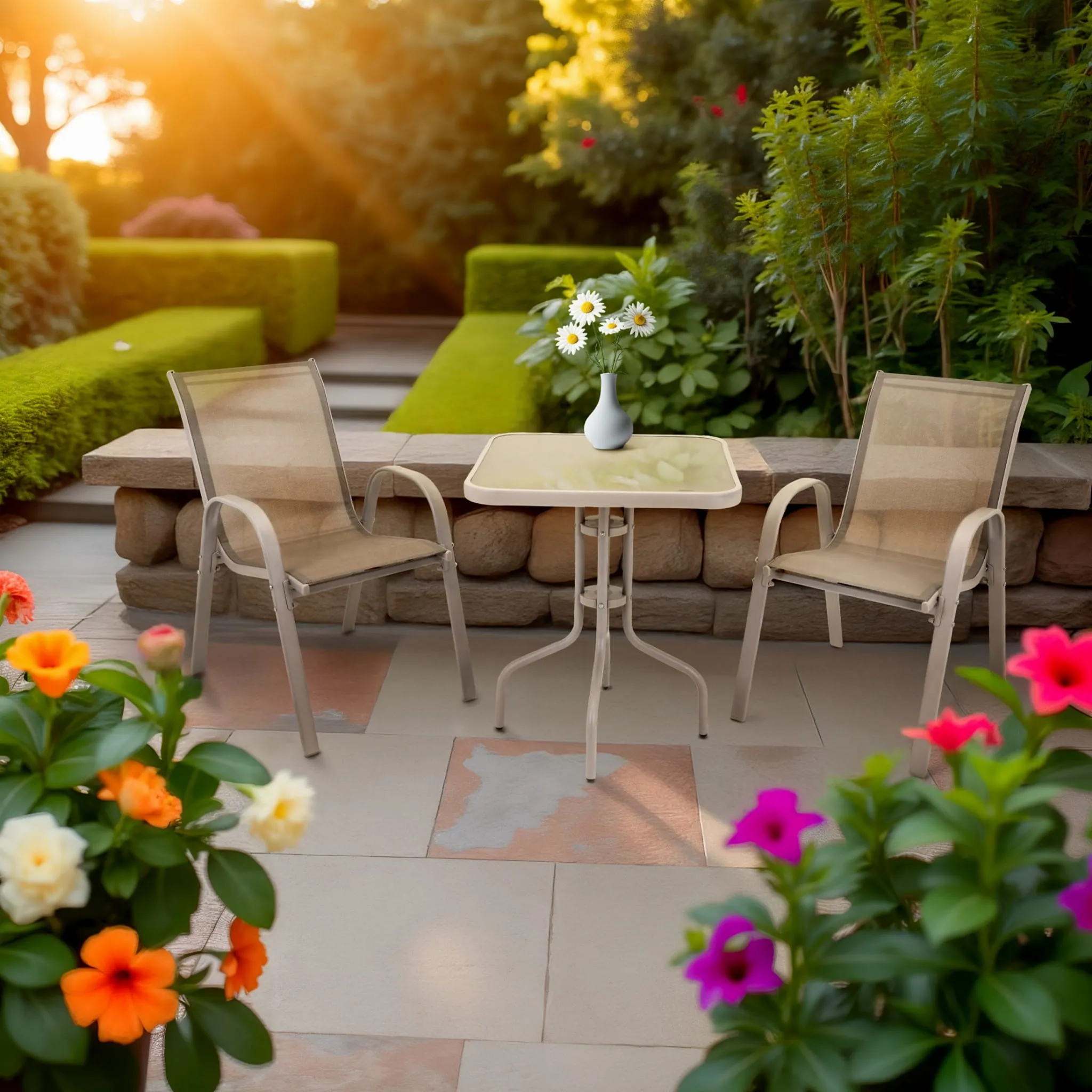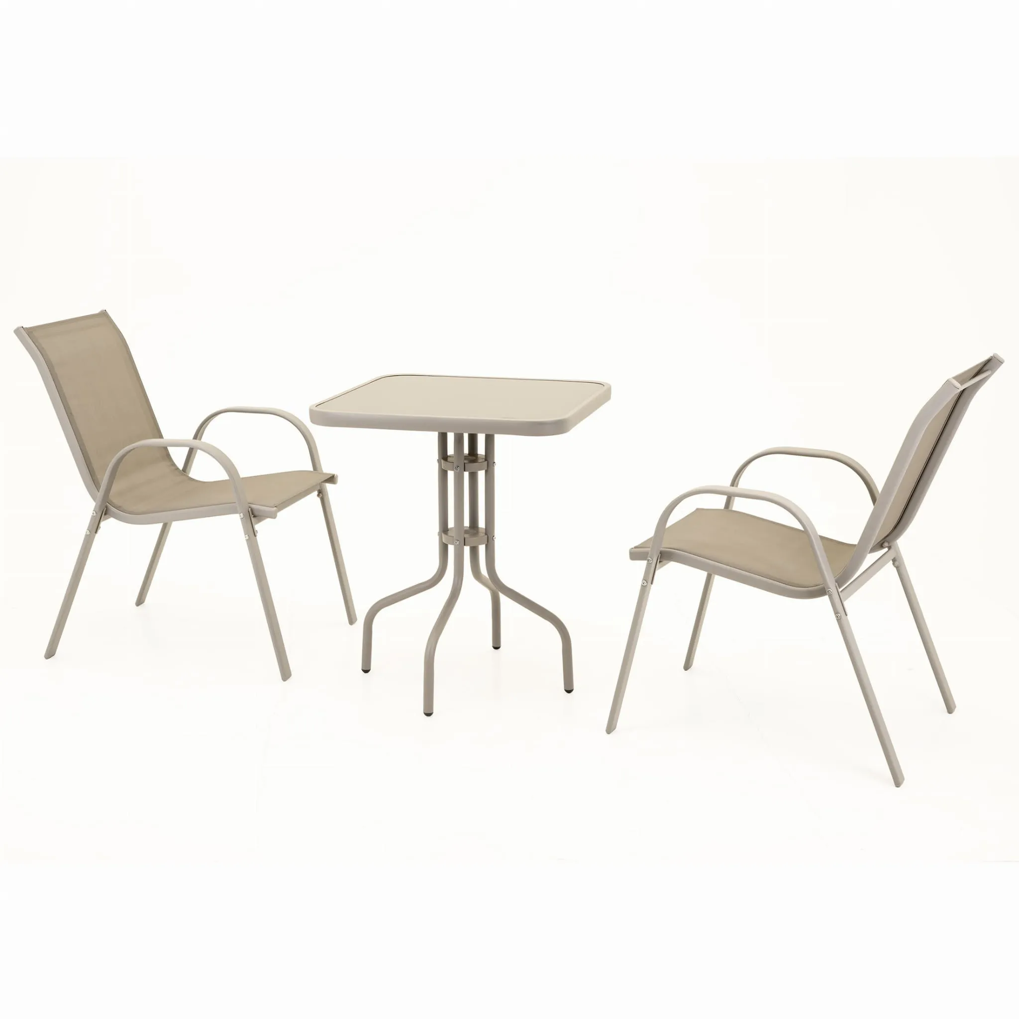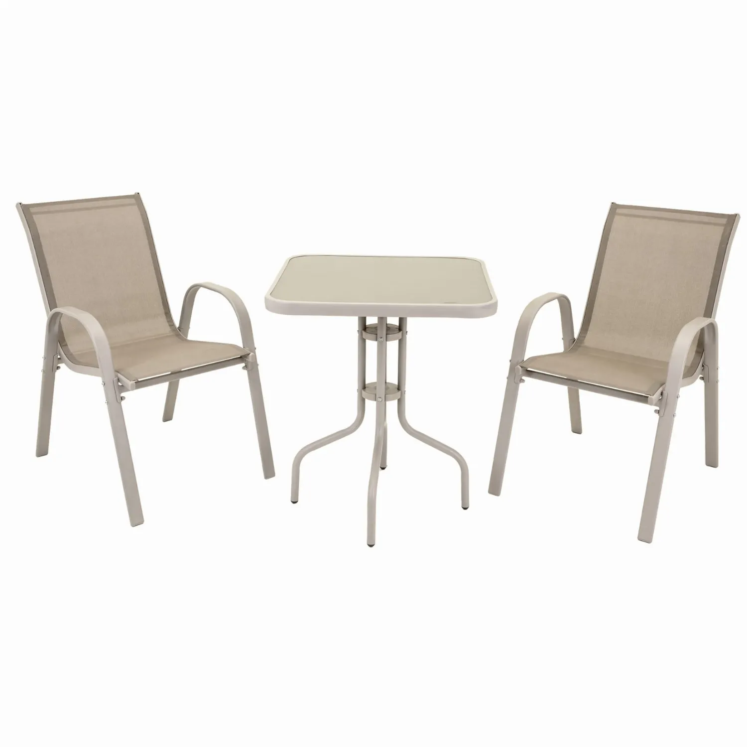 Zestaw mebli ogrodowych składający się ze stolika z hartowanym szkłem i dwóch wygodnych krzeseł to idealne rozwiązanie na balkon, taras lub do ogrodu. Blat z hartowanego szkła jest odporny na uszkodzenia i bardzo łatwy w czyszczeniu, co gwarantuje estetyczny wygląd przez długi czas.