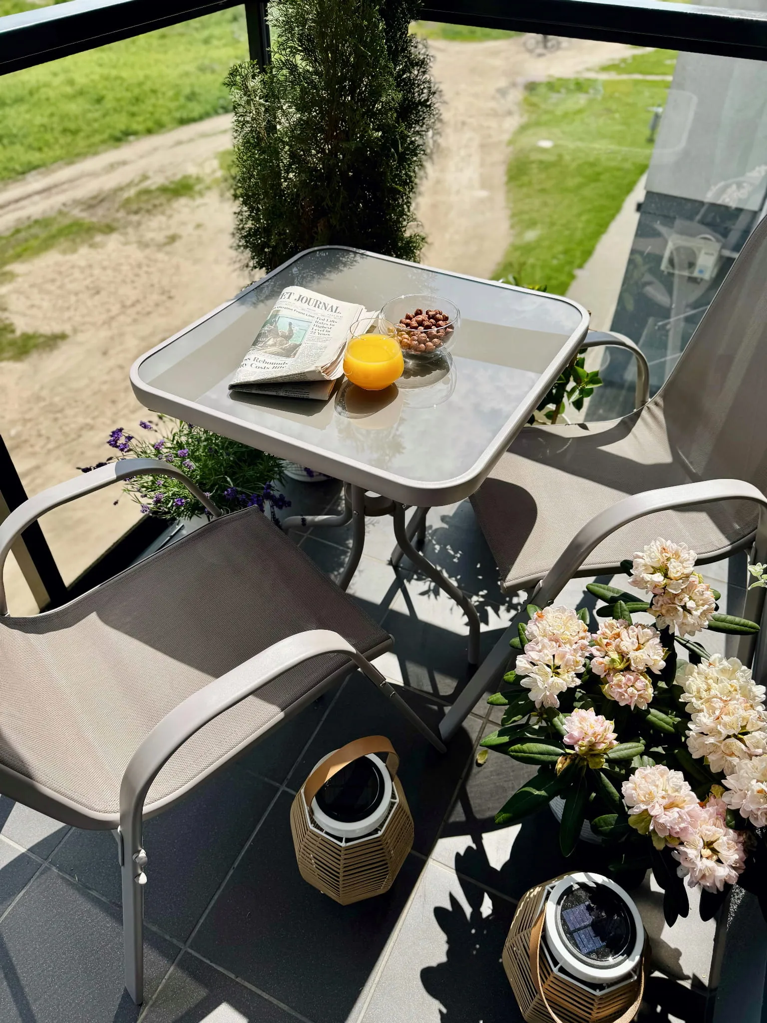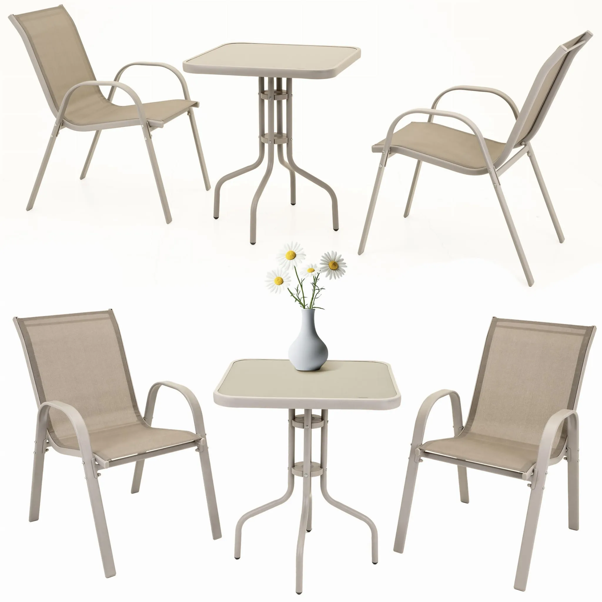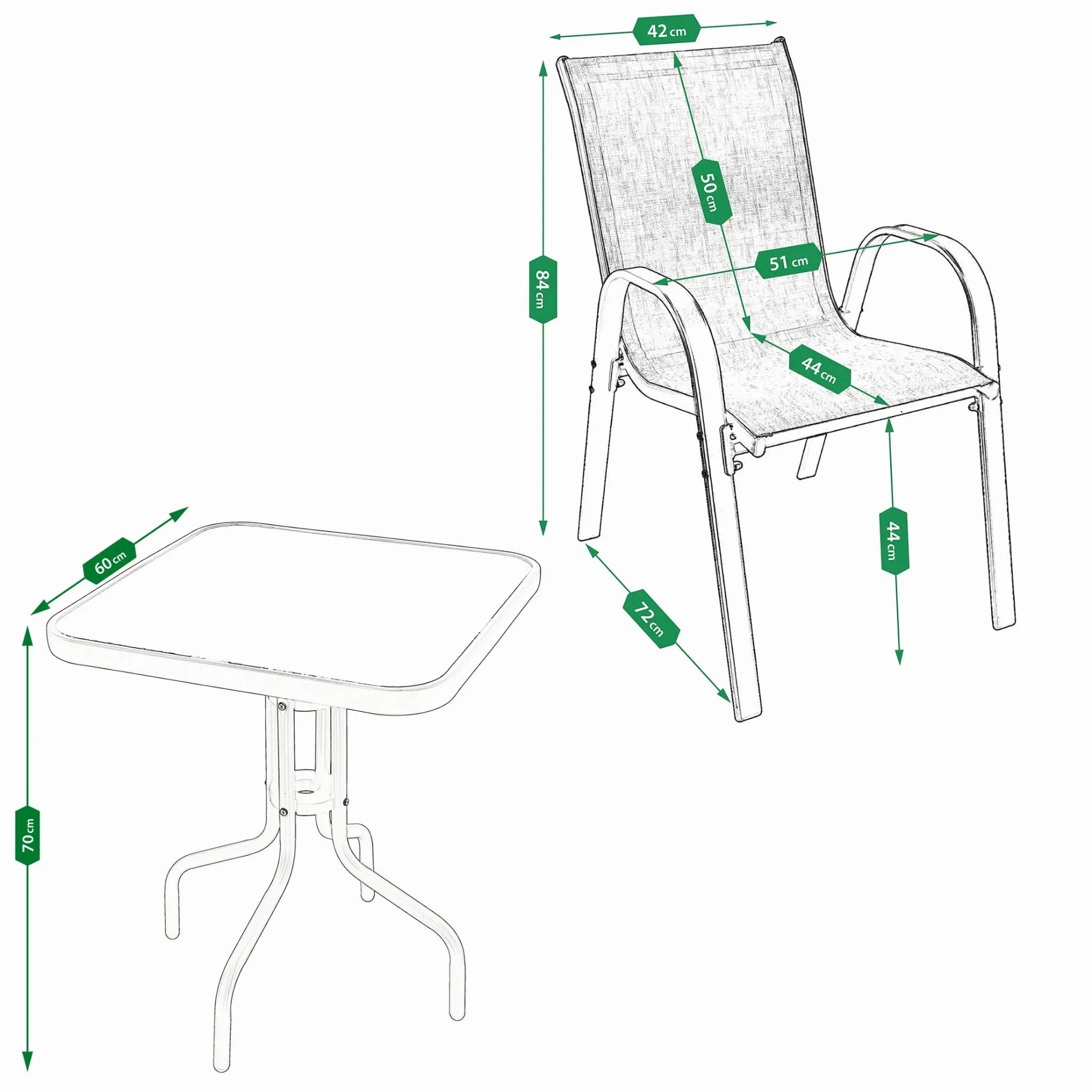 Zestaw mebli ogrodowych składający się ze stolika z hartowanym szkłem i dwóch wygodnych krzeseł to idealne rozwiązanie na balkon, taras lub do ogrodu. Blat z hartowanego szkła jest odporny na uszkodzenia i bardzo łatwy w czyszczeniu, co gwarantuje estetyczny wygląd przez długi czas.